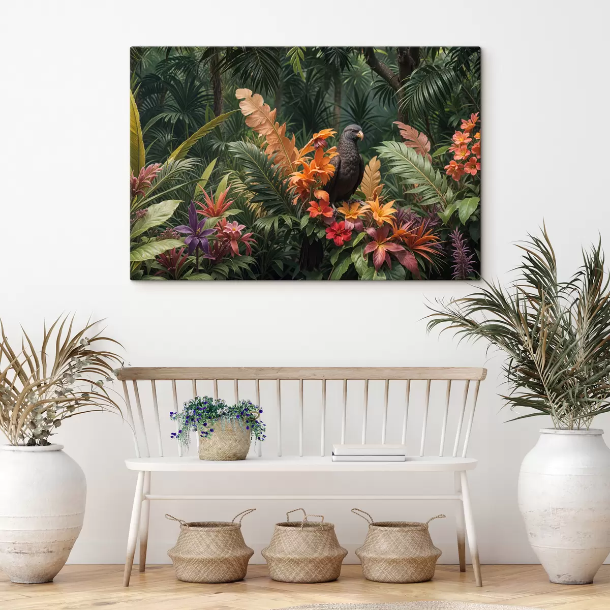 Tableau Oiseau tropical perché sur une branche entouré de feuillage vibrant, de feuilles de palmier, de fleurs et de plantes exotiques s40578