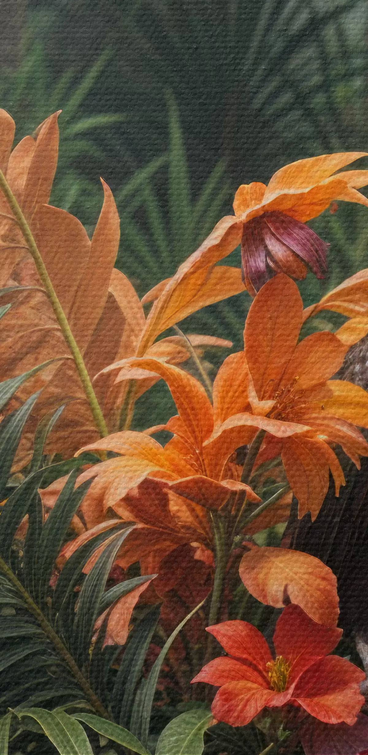 Tableau Oiseau tropical perché sur une branche entouré de feuillage vibrant, de feuilles de palmier, de fleurs et de plantes exotiques Nr s40578
