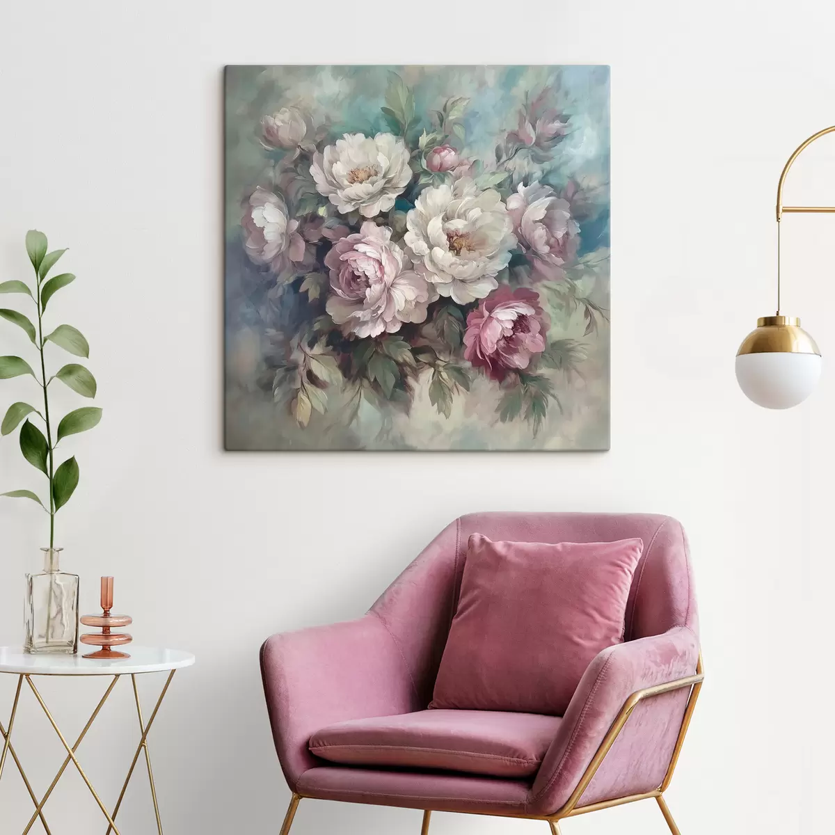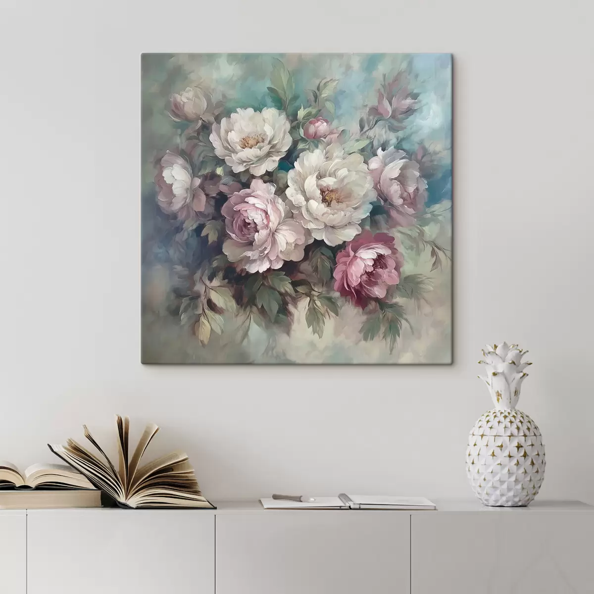 Tableau Bouquet de pivoines roses et blanches en peinture à l'huile s40582
