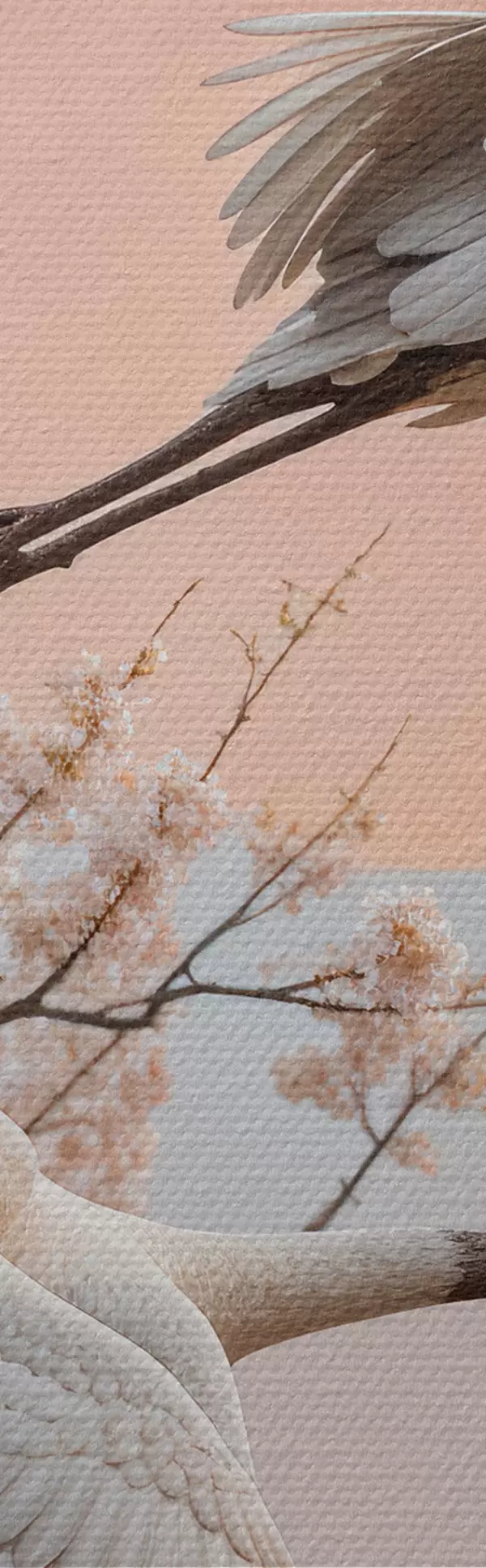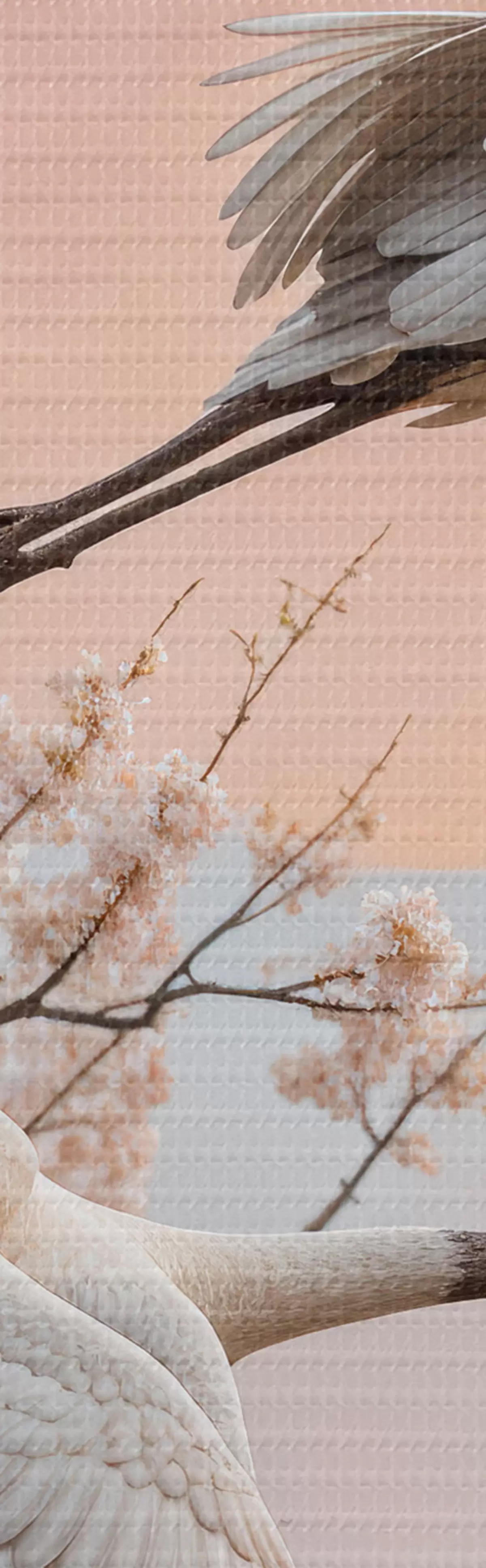 Tableau Deux grues blanches volant parmi les cerisiers en fleurs dans un ciel rose au coucher du soleil Nr s40601