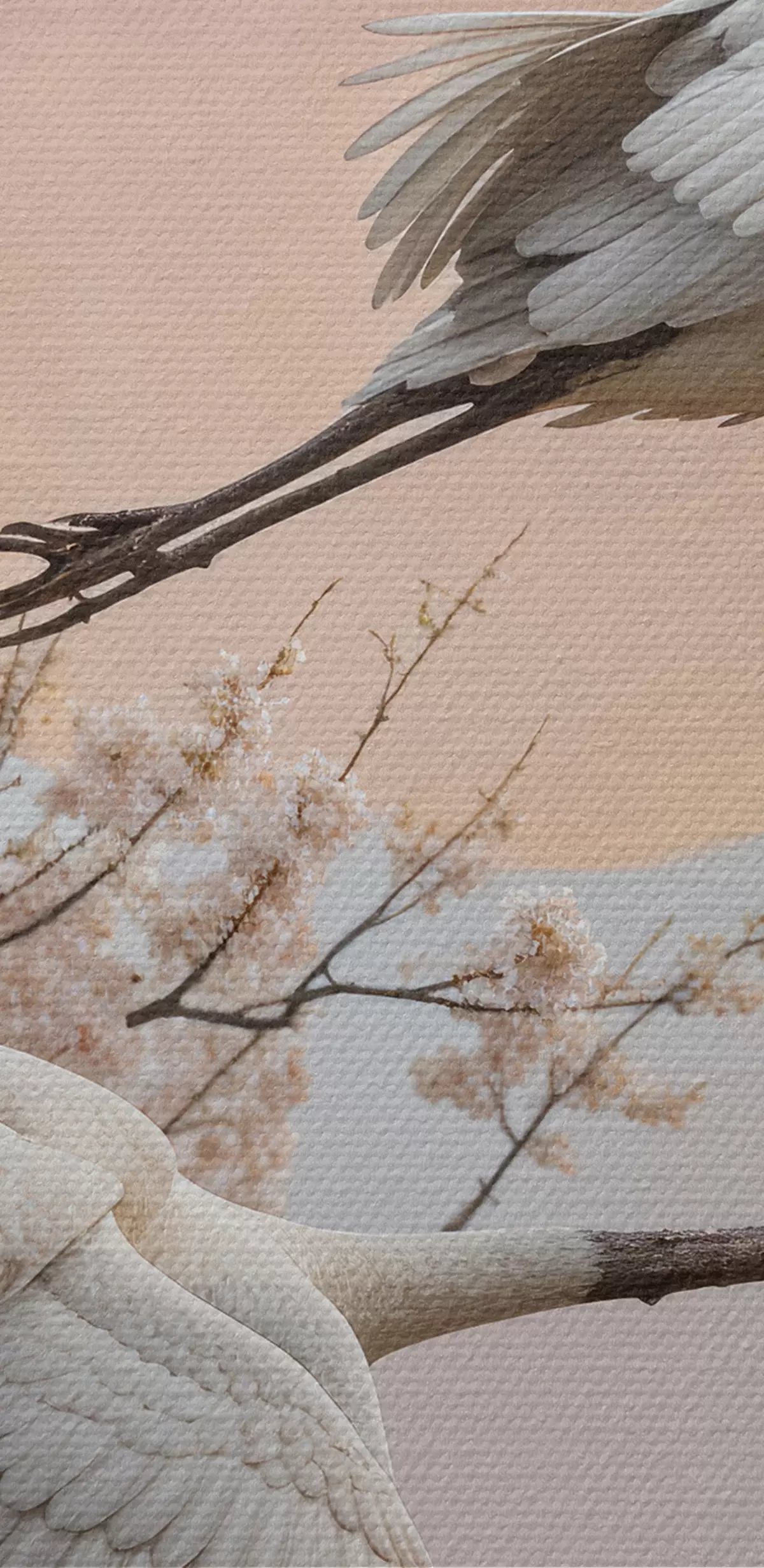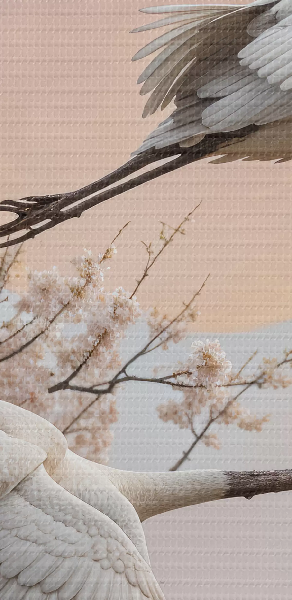 Tableau Deux grues blanches volant parmi les cerisiers en fleurs dans un ciel rose au coucher du soleil s40601