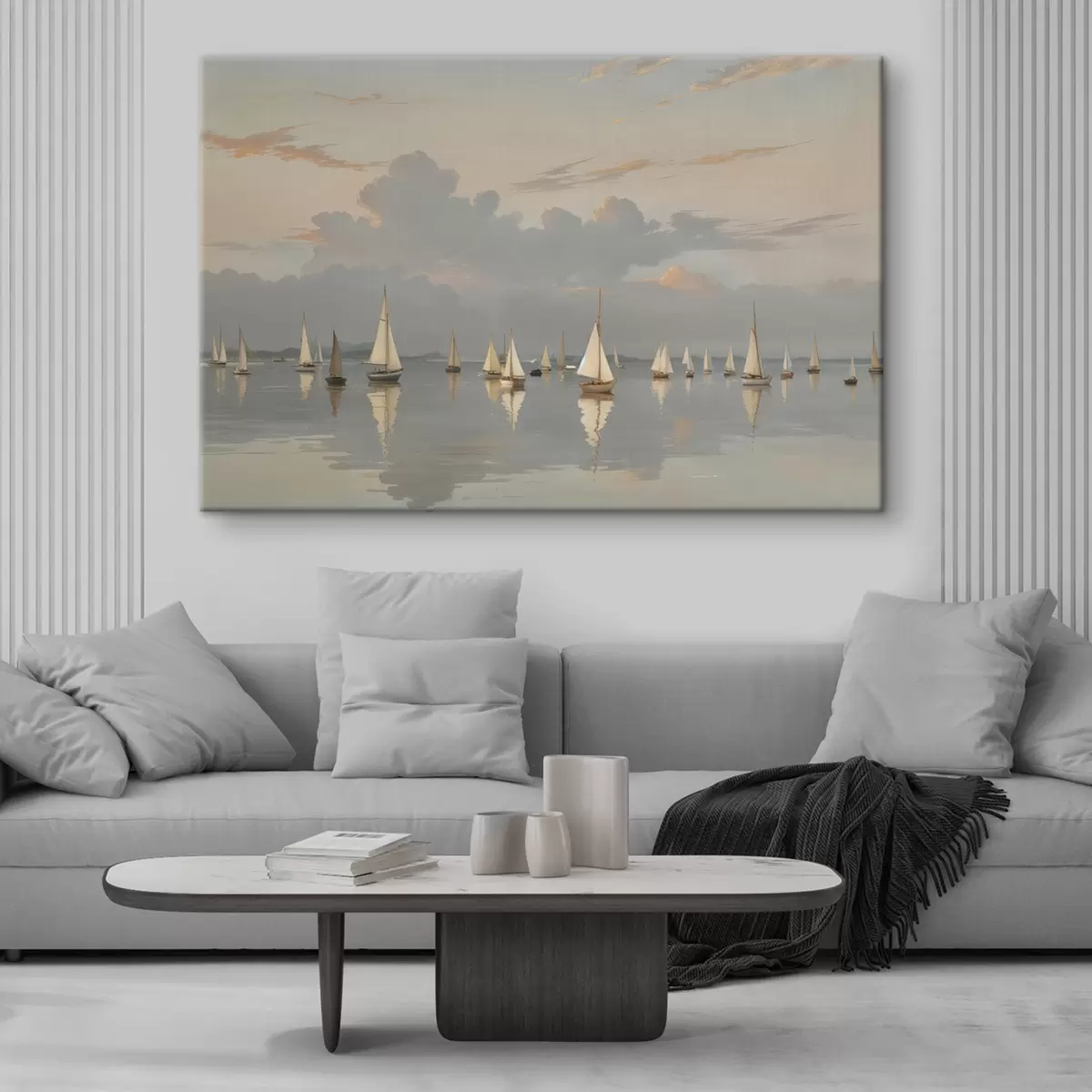 Tableau Une flotte de voiliers blancs sur un plan d'eau calme et réfléchissant au coucher du soleil, avec un ciel nuageux en arrière-plan Nr s40615