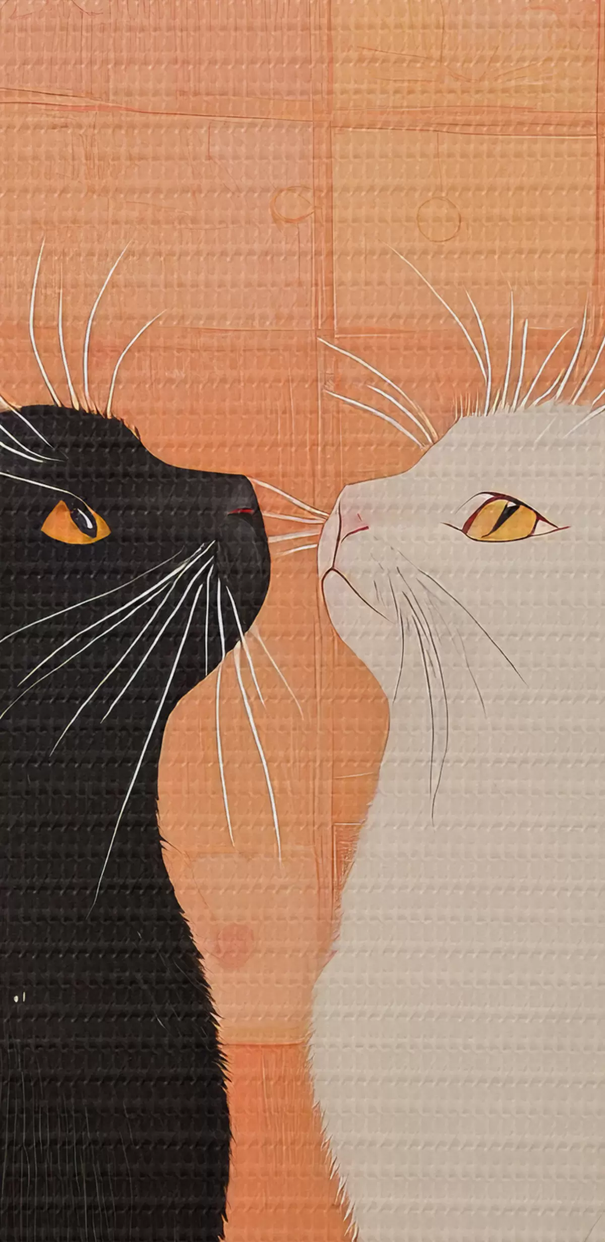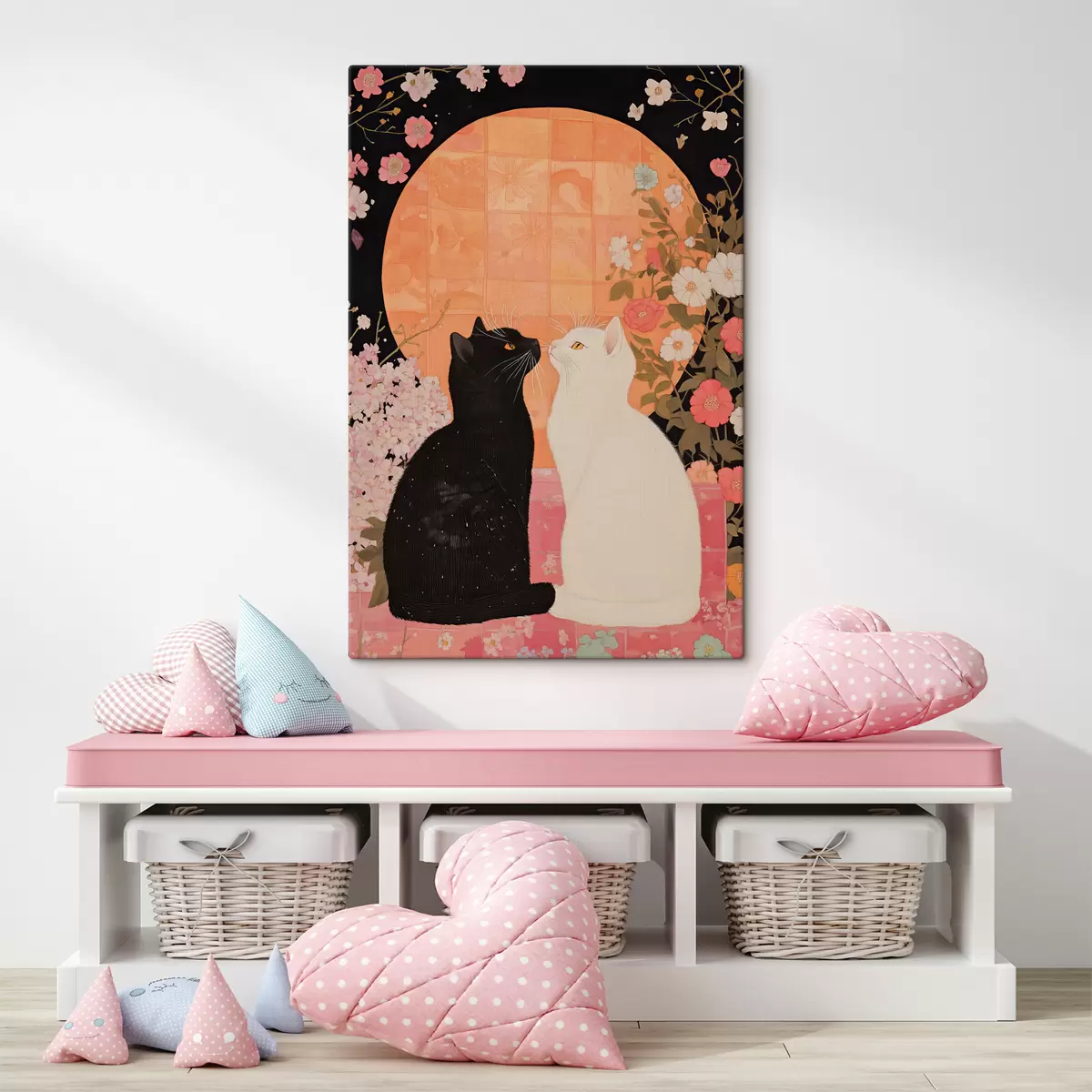 Tableau Chat noir et chat blanc se regardant mutuellement au coucher du soleil s40669