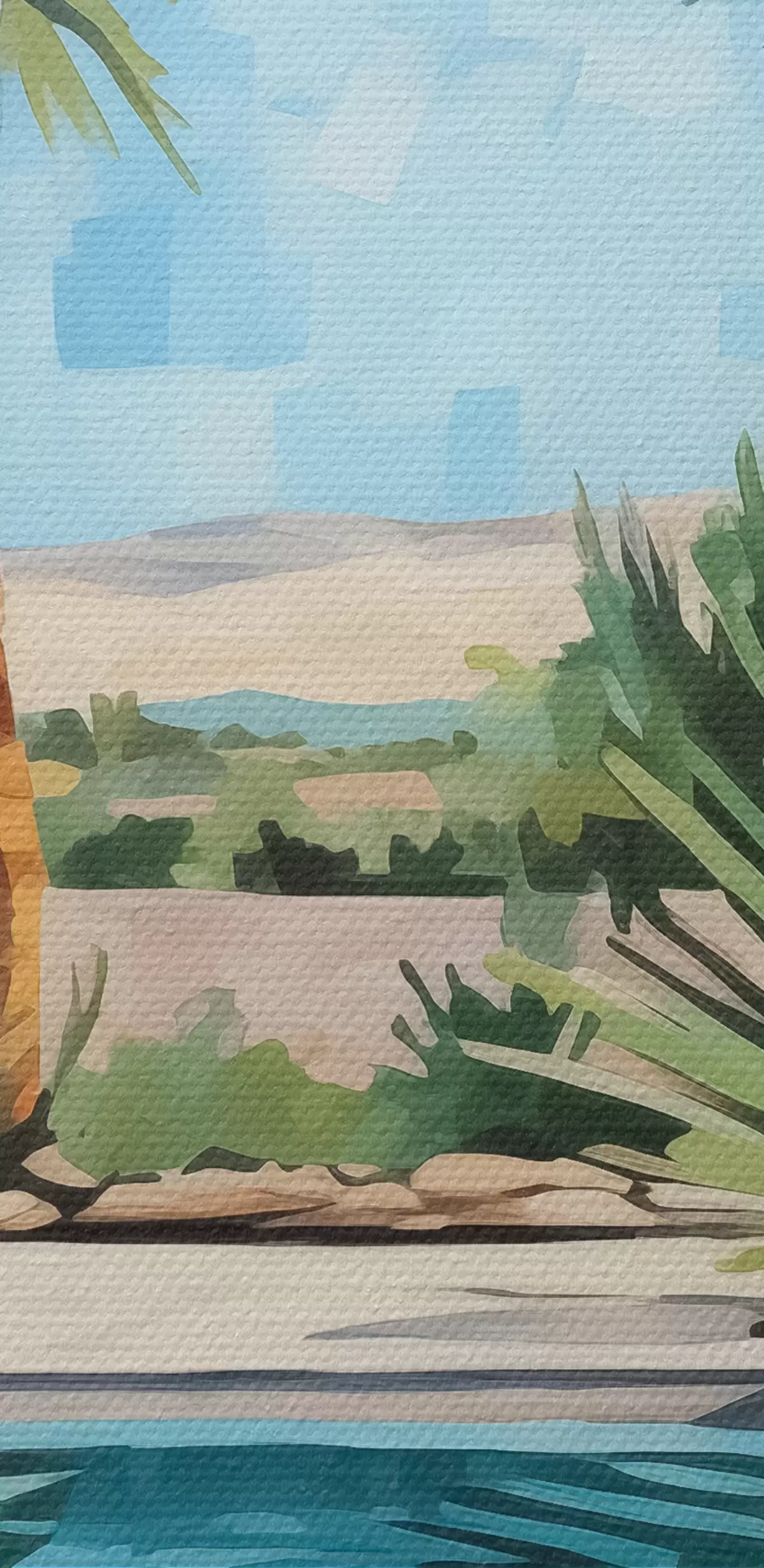Tableau Palmiers près de l'hôtel avec une piscine près des rochers, couleur bleu, vert, rouge s40748