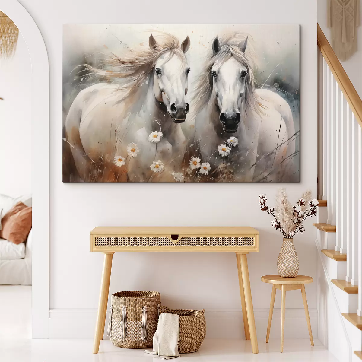 Tableau Une paire de chevaux blancs et gris près de marguerites Nr s40749