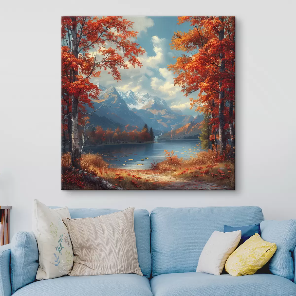 Tableau Paysage d'automne sur fond de montagnes près d'un étang Nr s40903