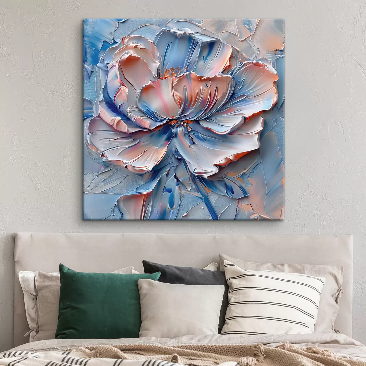 Tableau Grande fleur avec des coups de pinceau audacieux dans les couleurs bleu et pêche s41004