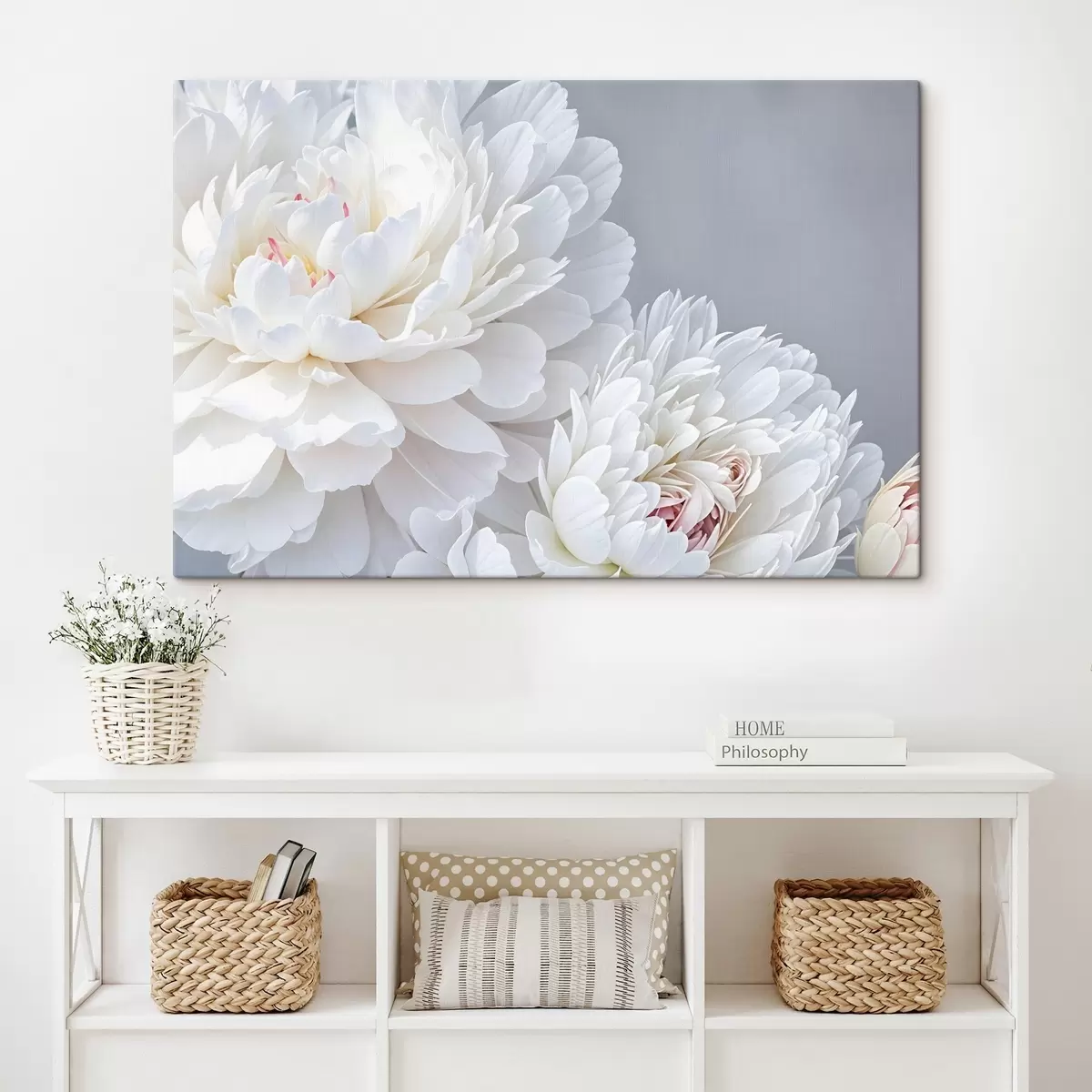 Tableau Fleurs de pivoines blanches aux pétales doux et délicats sur fond gris clair s41085