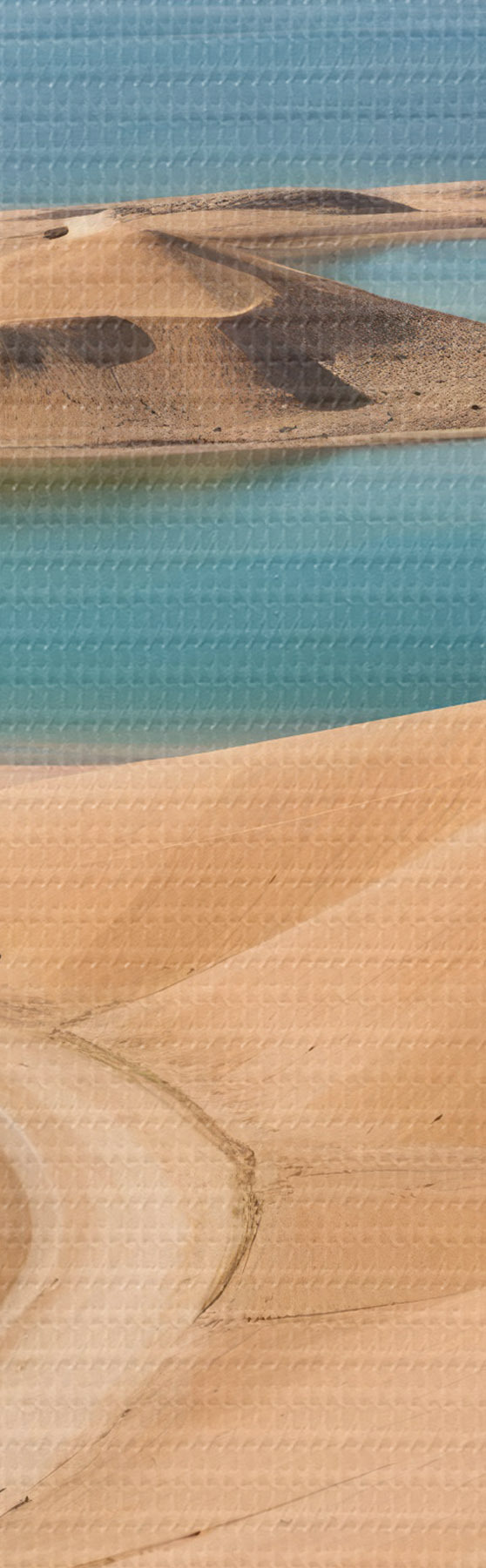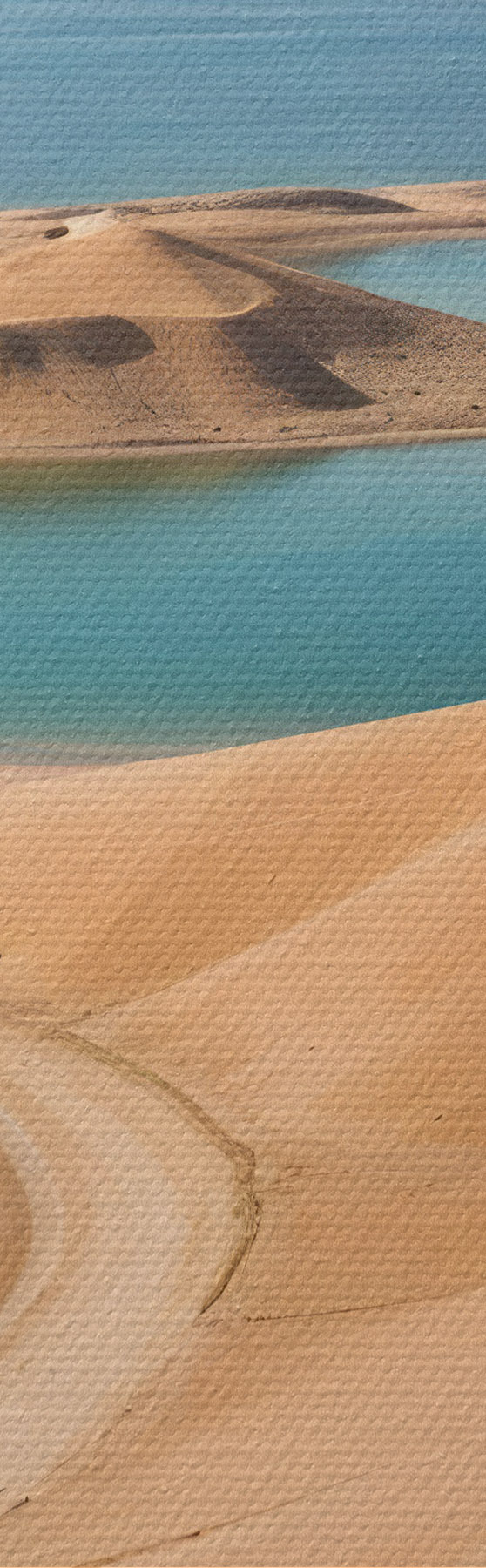 Tableau Un vaste paysage désertique avec des dunes de sable ondulantes et des lacs turquoise, entouré de montagnes escarpées s41087