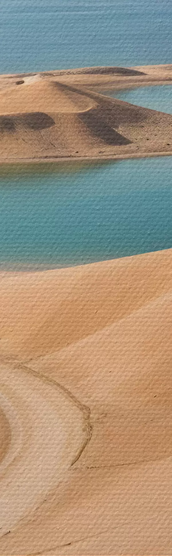 Tableau Un vaste paysage désertique avec des dunes de sable ondulantes et des lacs turquoise, entouré de montagnes escarpées Nr s41087