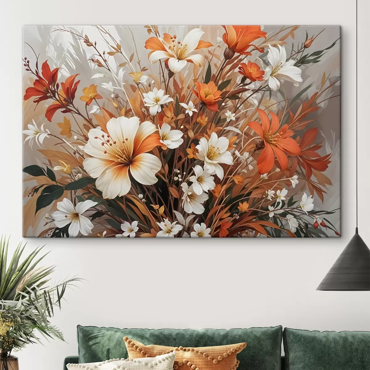 Tableau Un bouquet vibrant de fleurs orange et blanches, comprenant des lys et d'autres fleurs délicates s41099