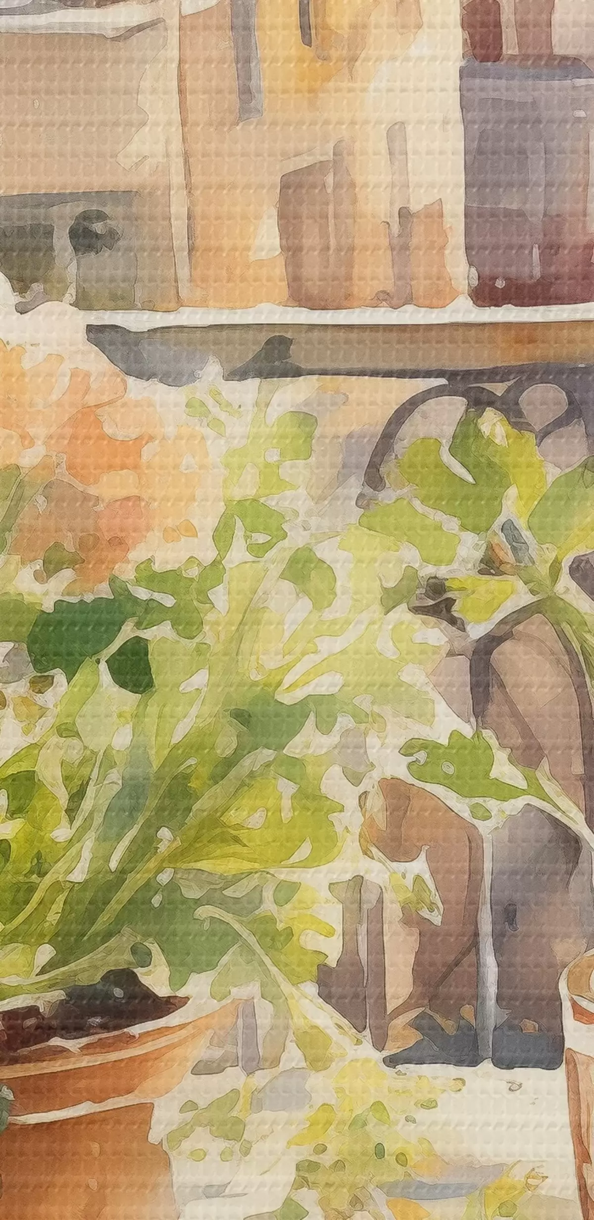 Tableau Dîner aquarelle, vue de la ville, fleurs, nature, salade verte s41166
