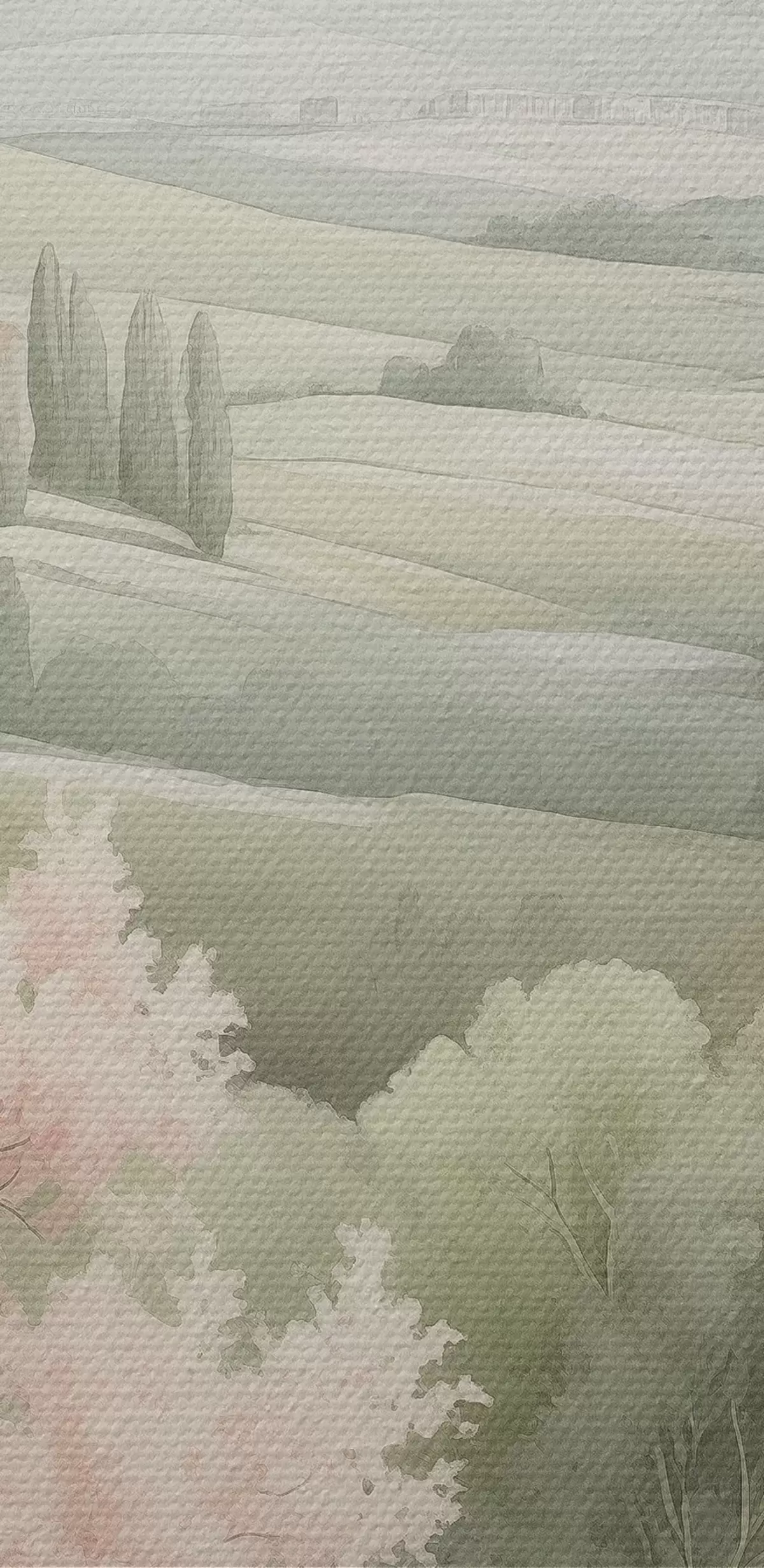 Tableau Aquarelle nature, couleurs douces, roses, arbres, collines vertes s41223