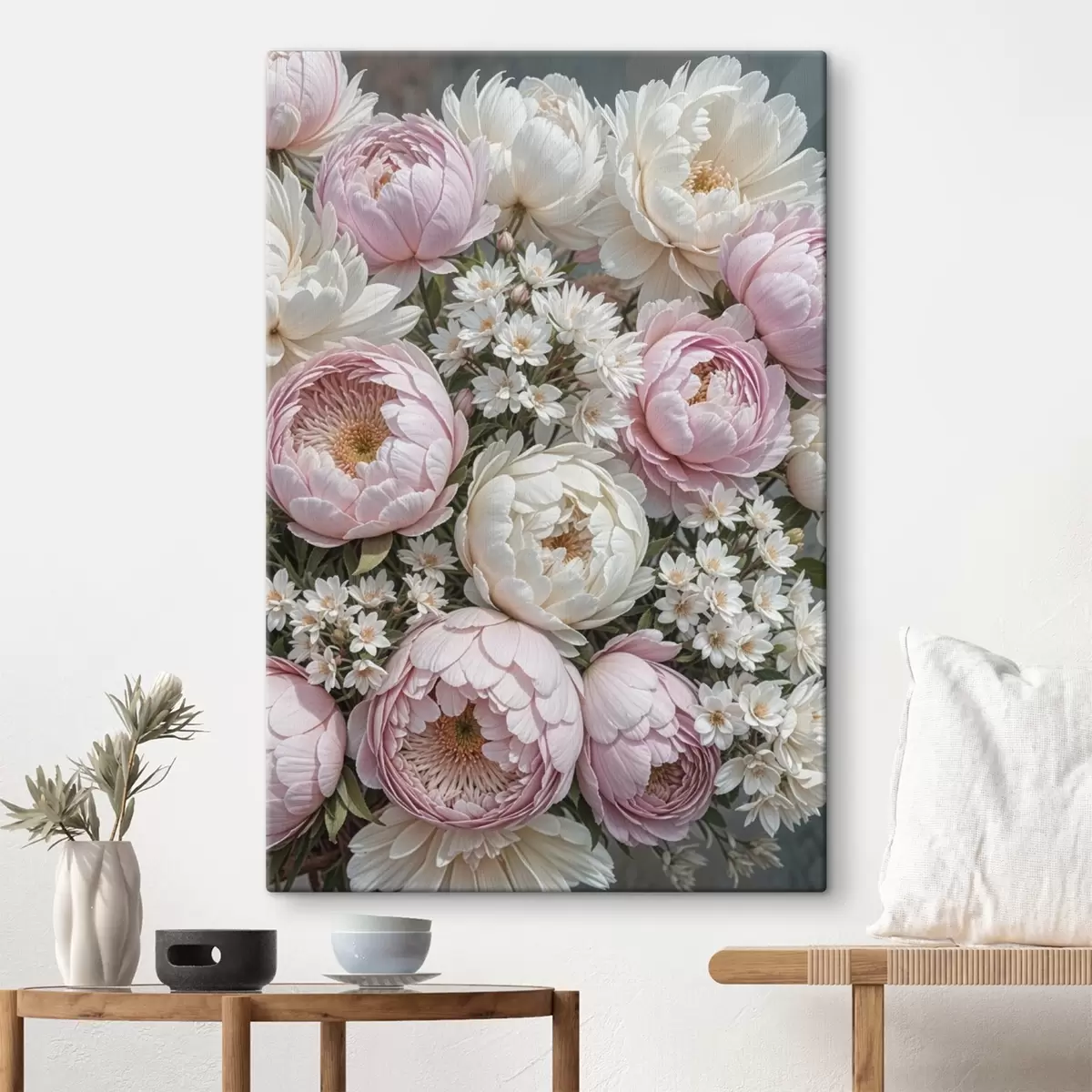 Tableau Un bouquet de pivoines rose pastel et de marguerites blanches, disposées dans une belle composition florale s41255