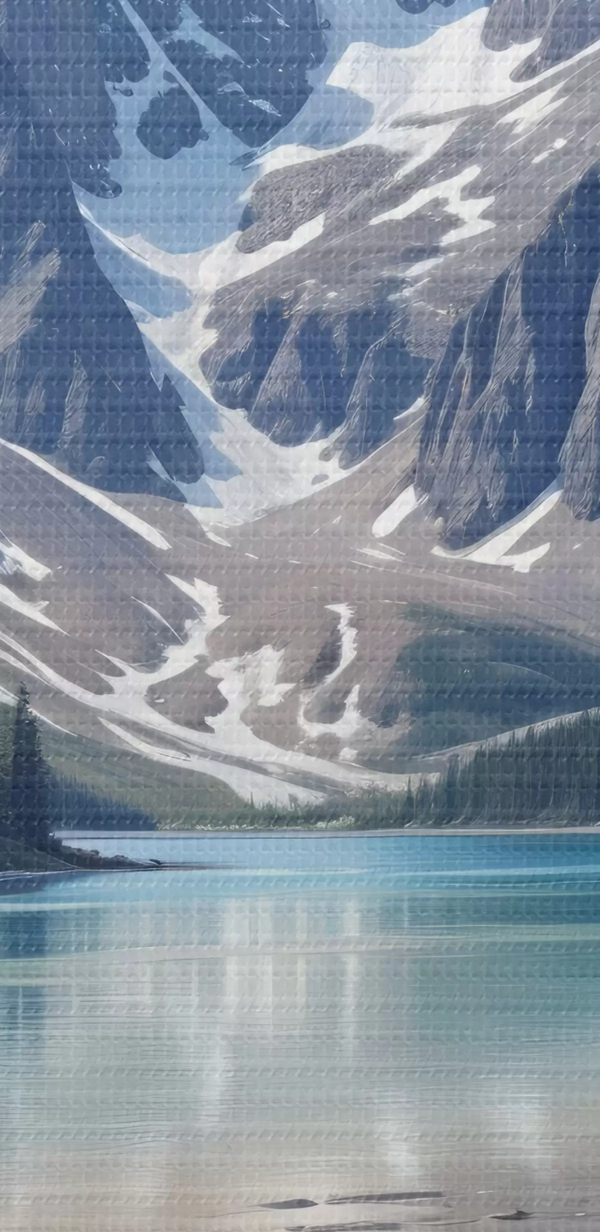 Tableau Un lac alpin serein entouré de majestueuses montagnes enneigées, d'une forêt dense et d'un ciel nuageux  s41264
