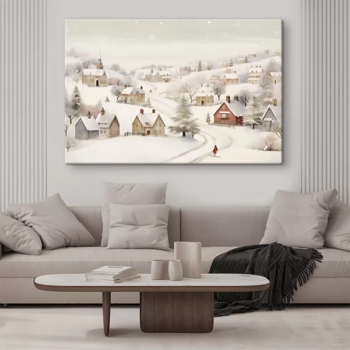 Tableau Village d'hiver, aquarelle, flocons de neige, couleurs douces, arbres, paysage  s41381
