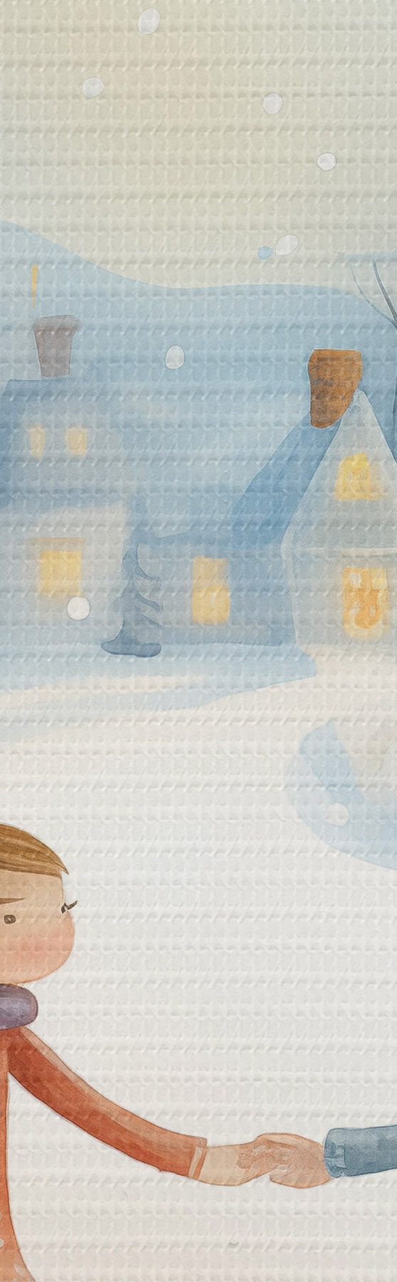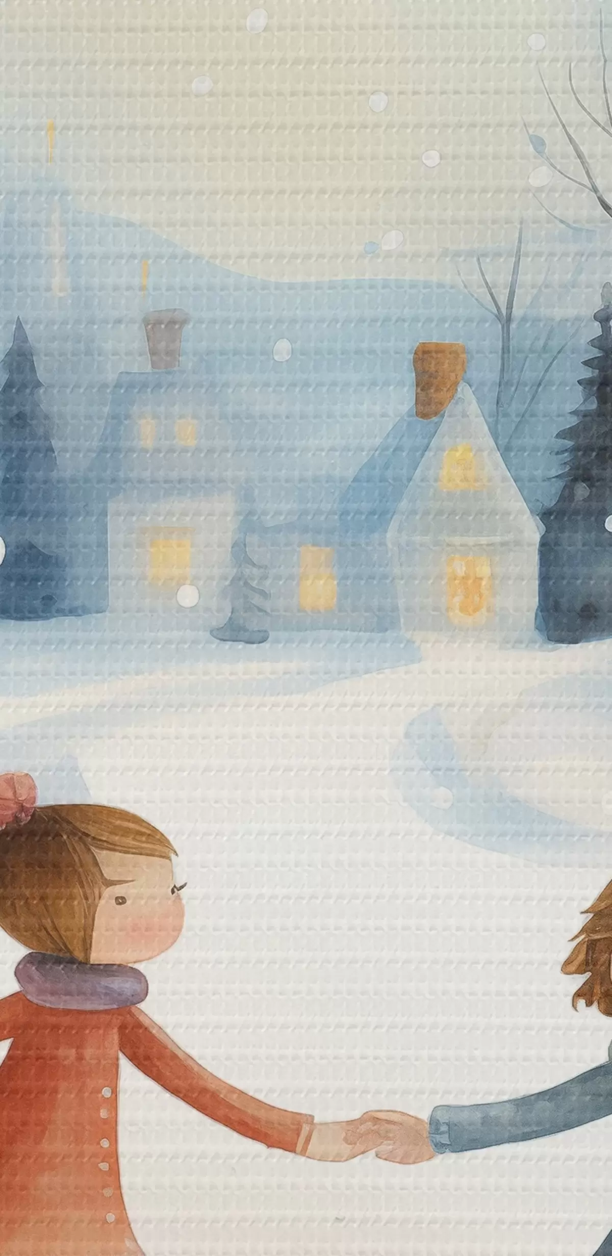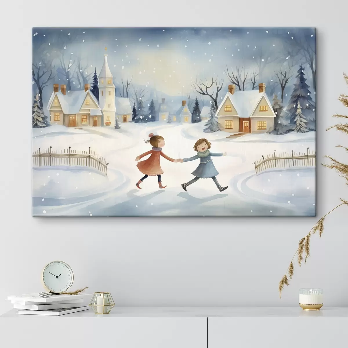 Tableau Filles dans le village d'hiver, flocons de neige, aquarelle, maisons, forêt s41385