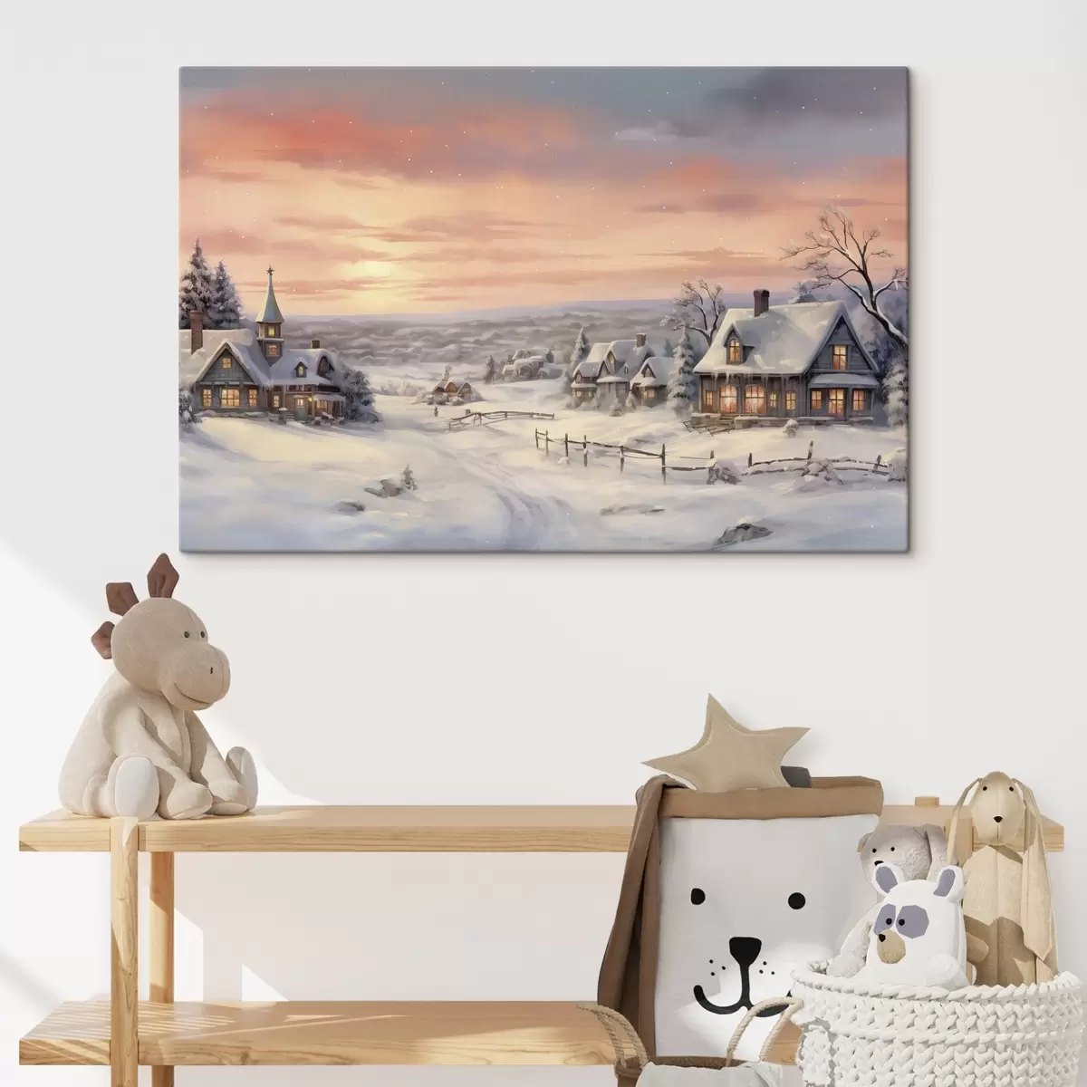 Tableau Coucher de soleil dans le village d'hiver, rustique, aquarelle, flocons de neige s41386