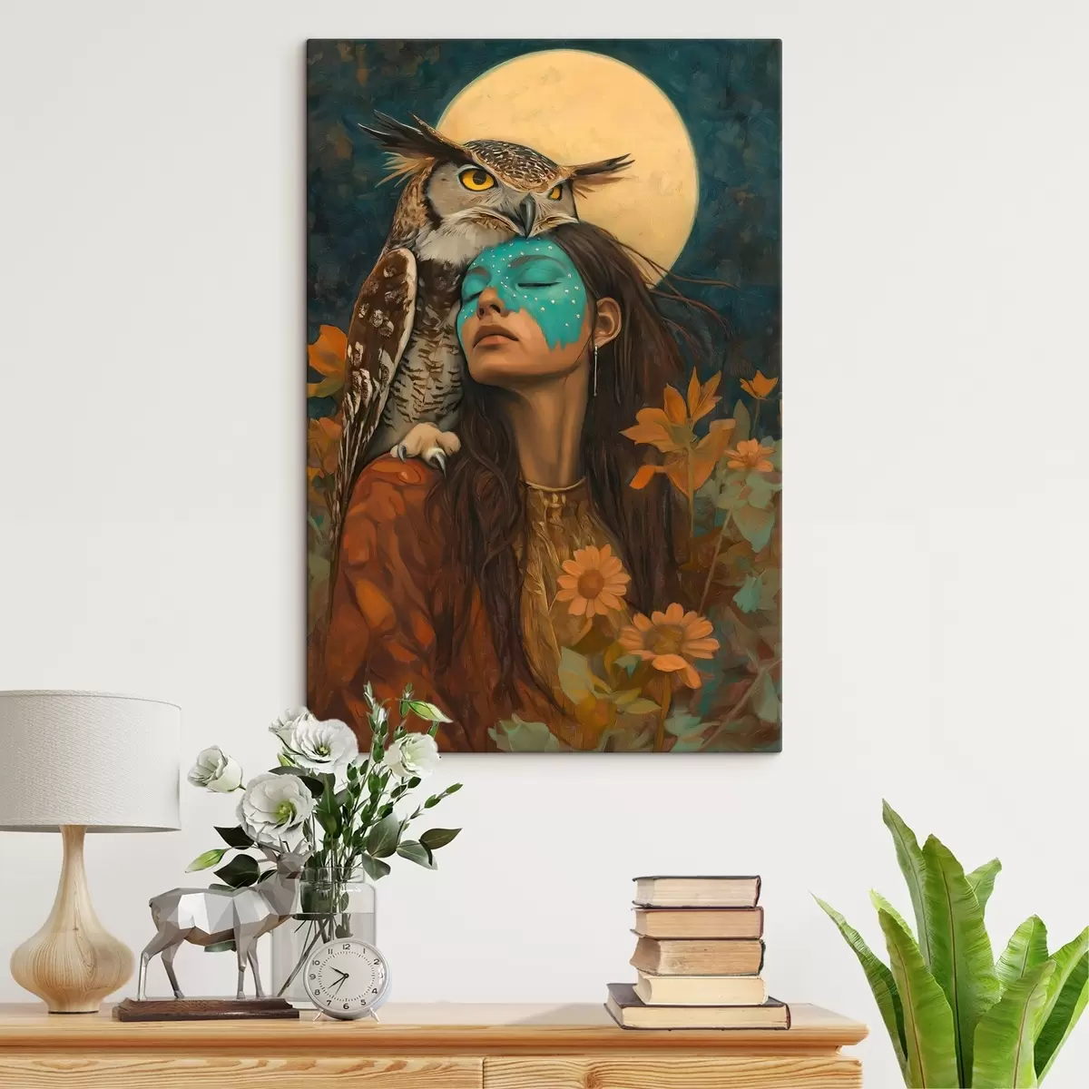 Tableau Femme avec hibou, style tribal, pleine lune, fleurs s41444