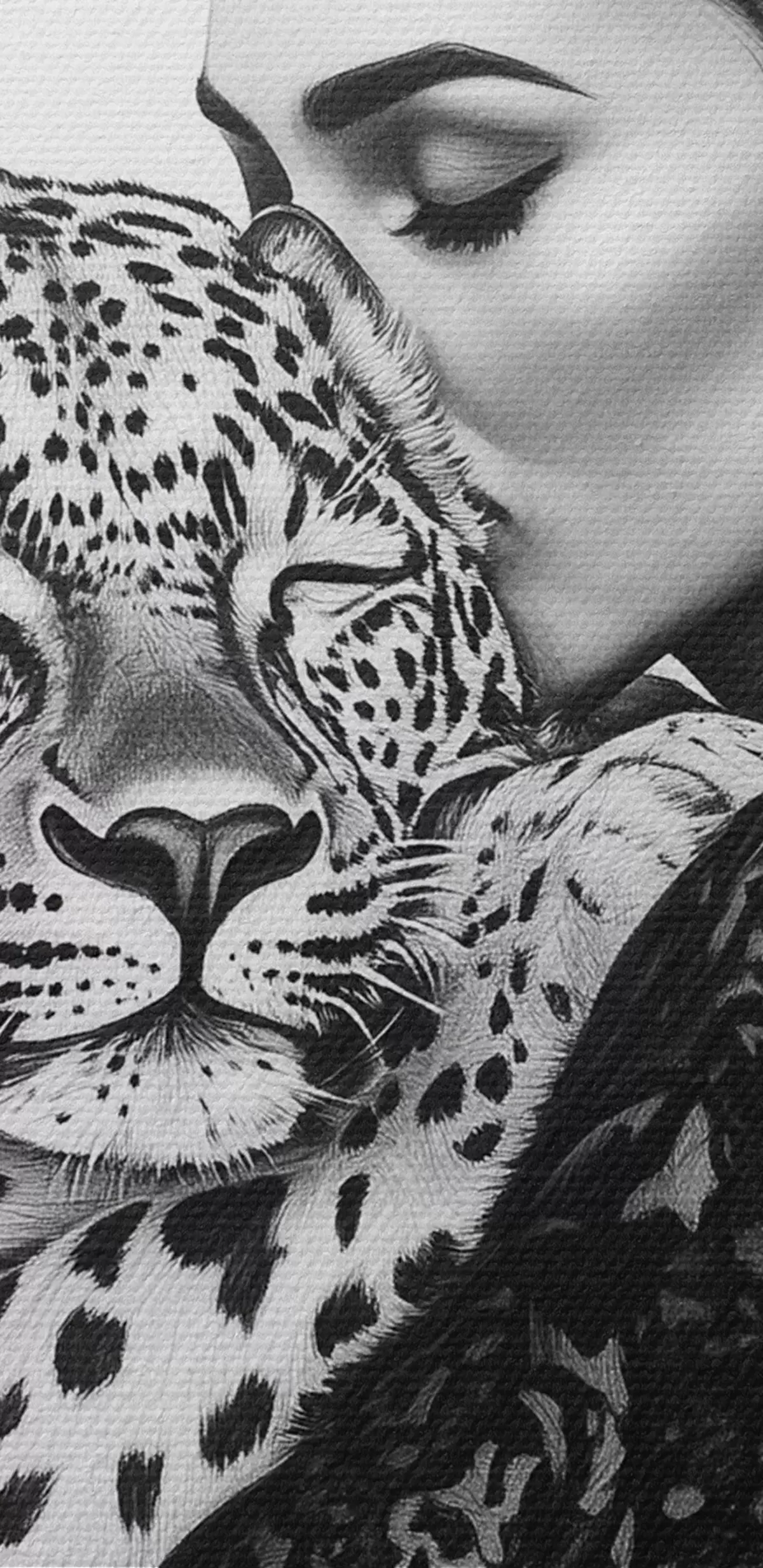 Tableau Femme embrassant un léopard, dessin au crayon, animaux sauvages, noir et blanc s41457