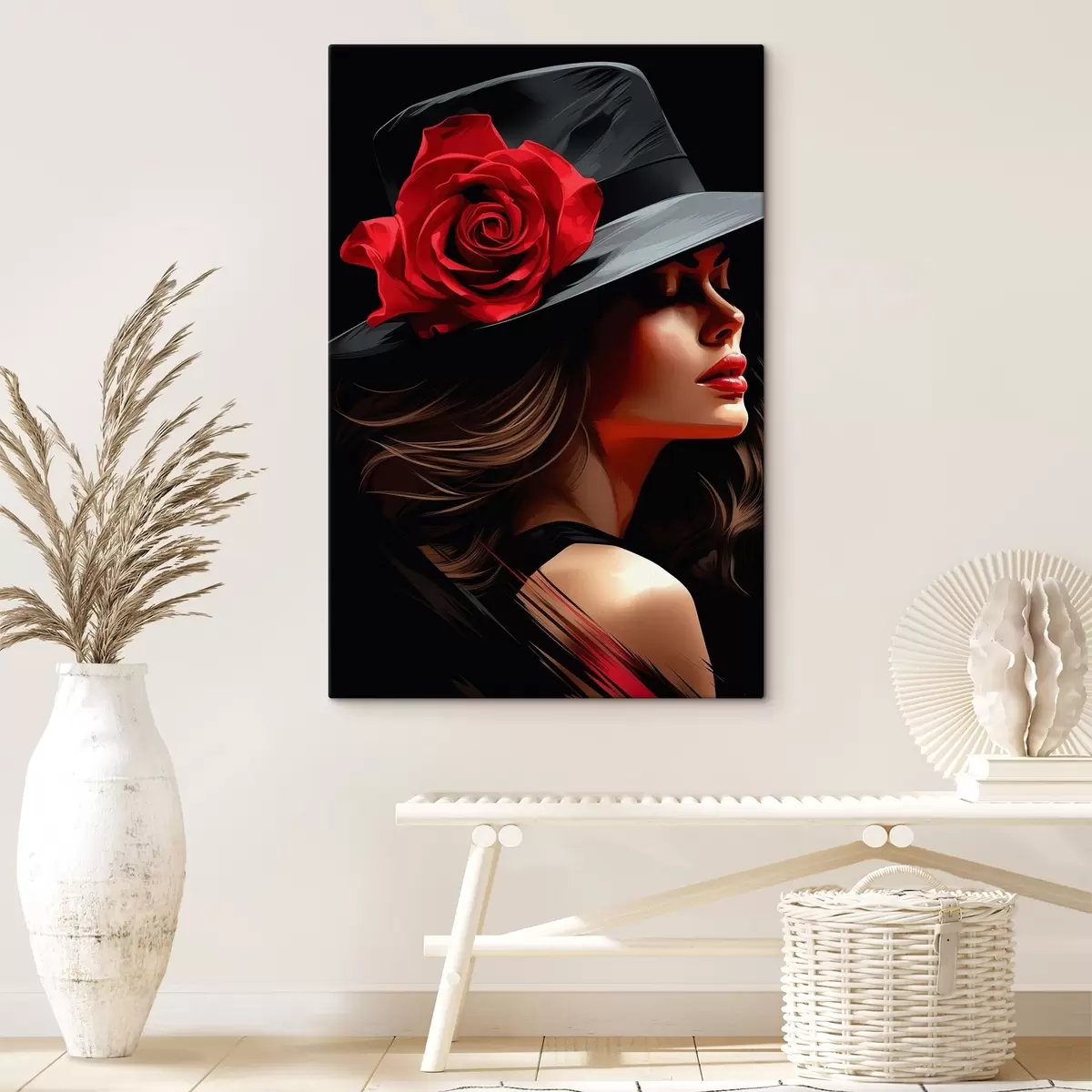 Tableau Illustration fille au chapeau avec une belle rose chic s41546