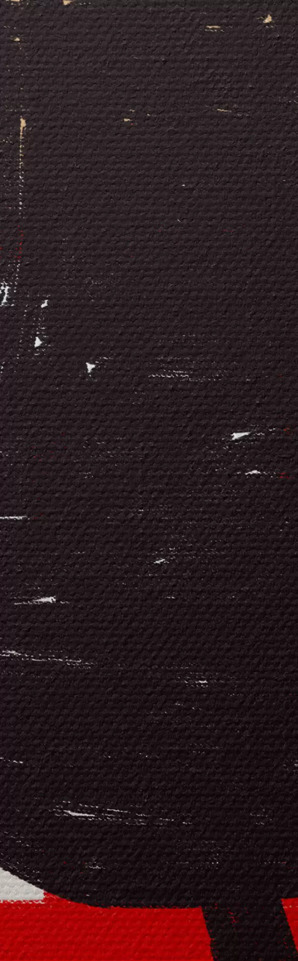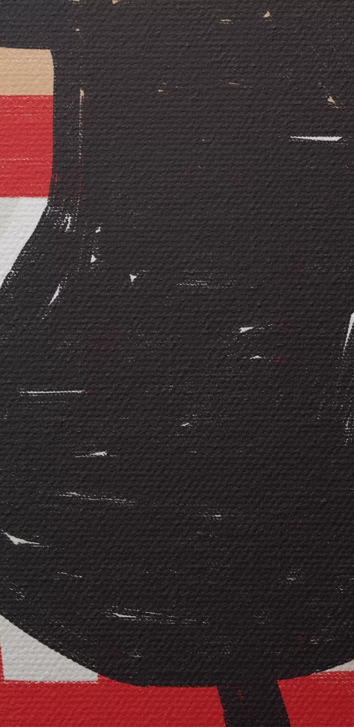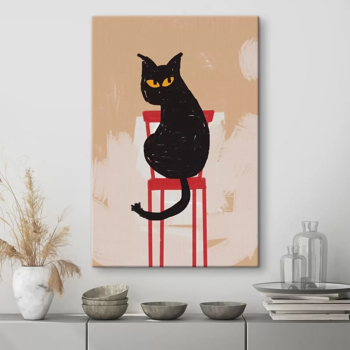 Tableau Chat noir assis sur une chaise rouge sur fond beige, traits grossiers, imitation de peinture s41612