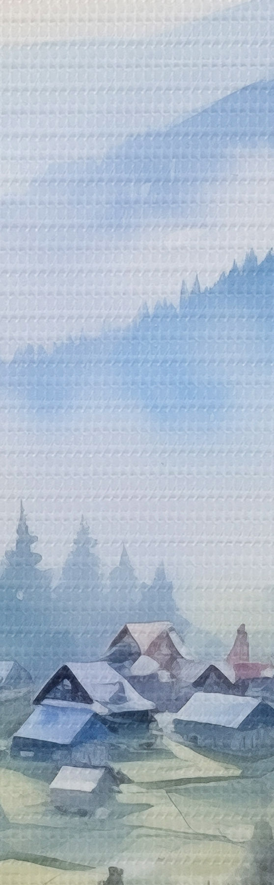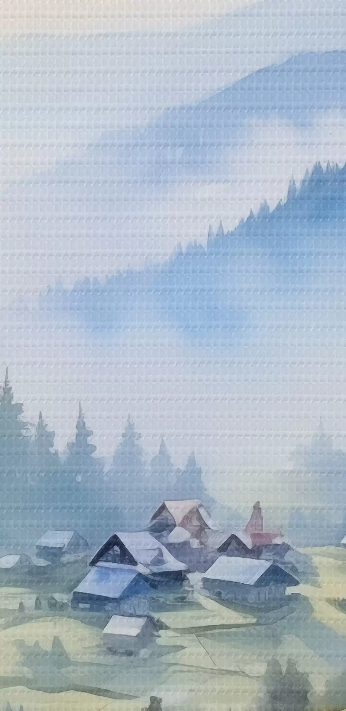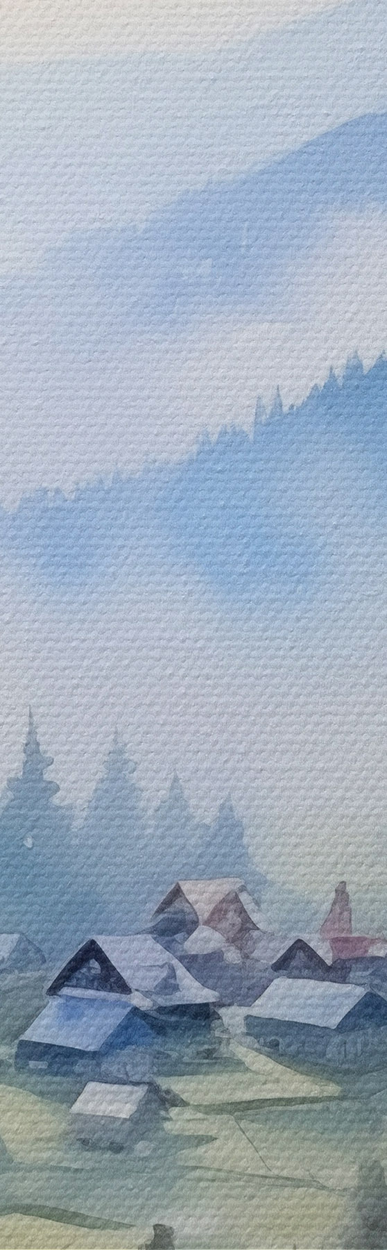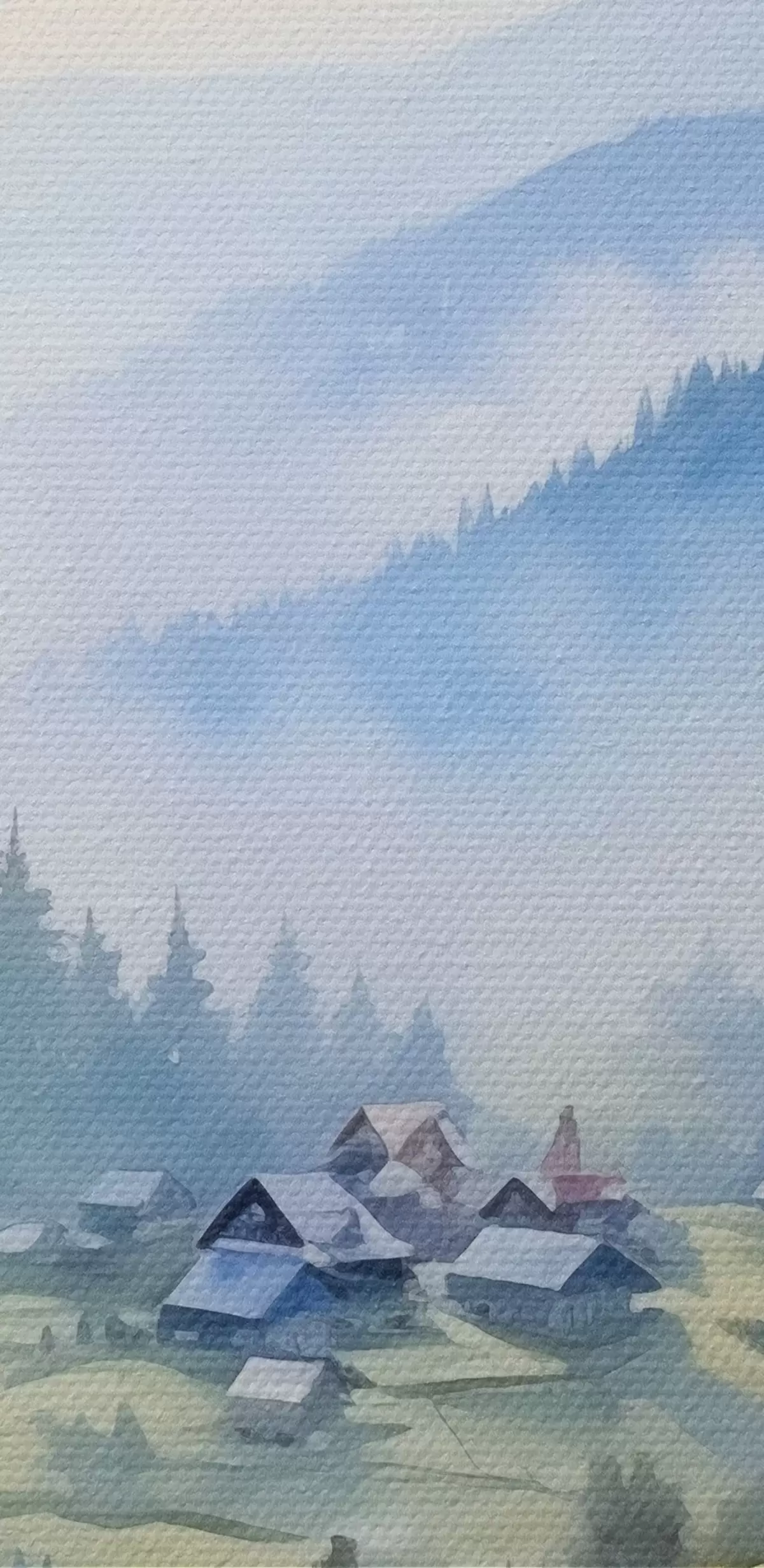 Tableau Village des Carpates dans les montagnes brumeuses, forêt, aquarelle Nr s41648