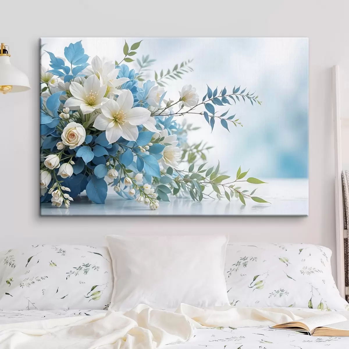 Tableau Bouquet de fleurs blanches et bleues avec des feuilles vertes sur un fond doux et flou Nr s41715
