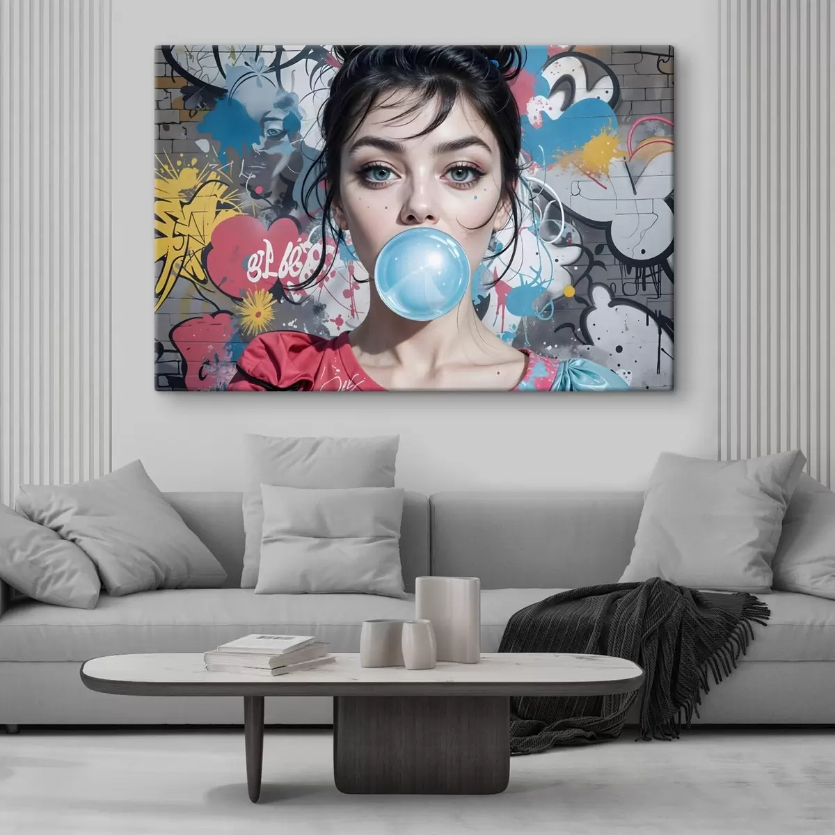 Tableau Une femme soufflant une grosse bulle de chewing-gum bleue sur un fond de graffiti coloré Nr s41719