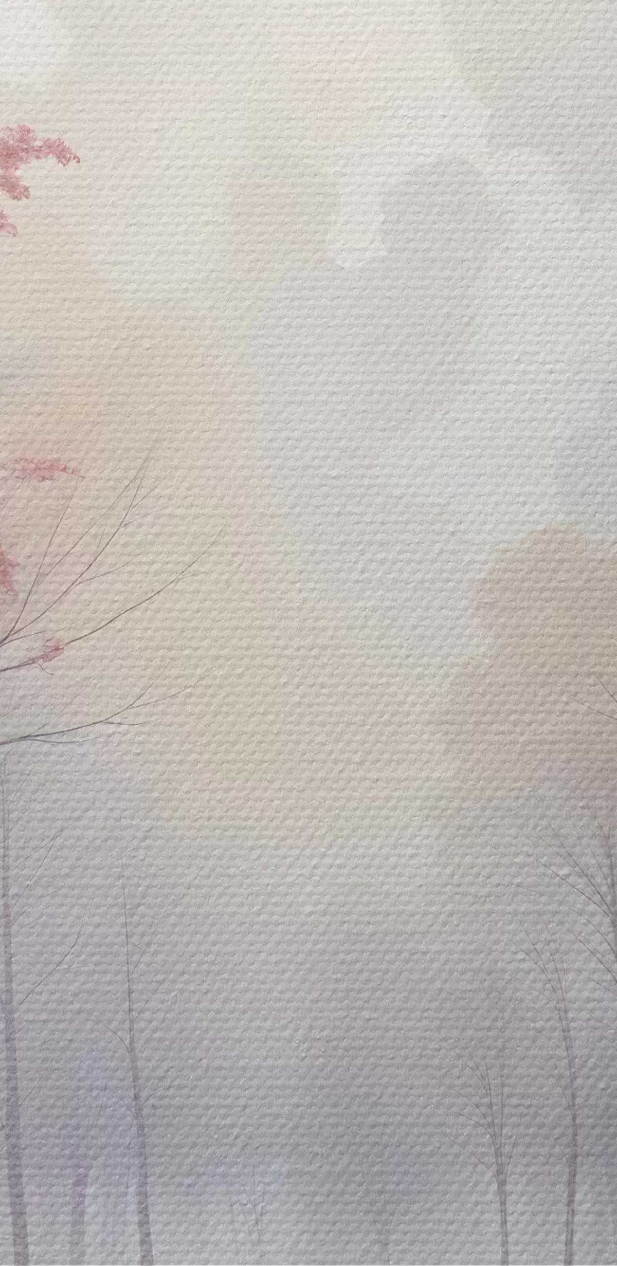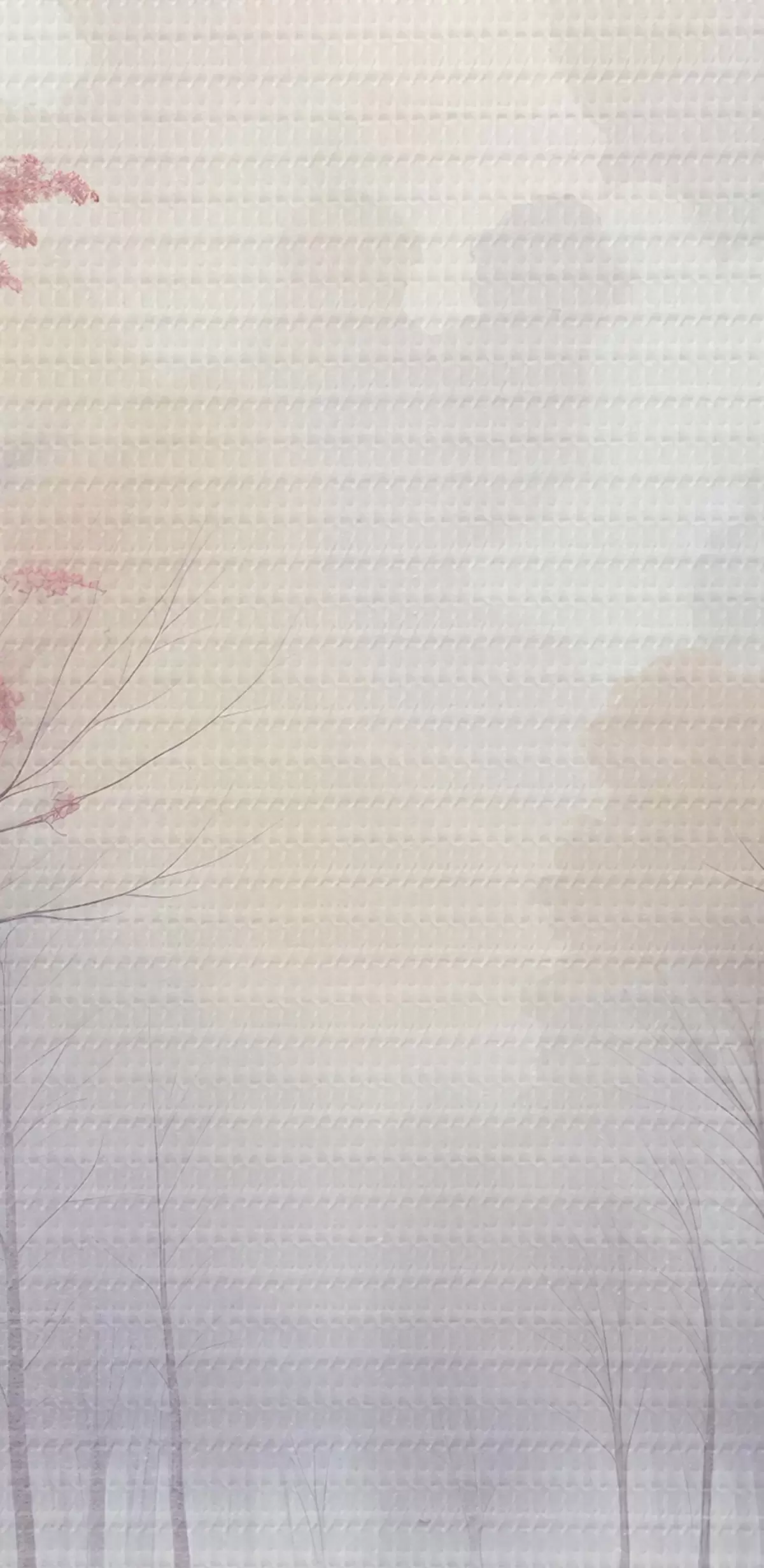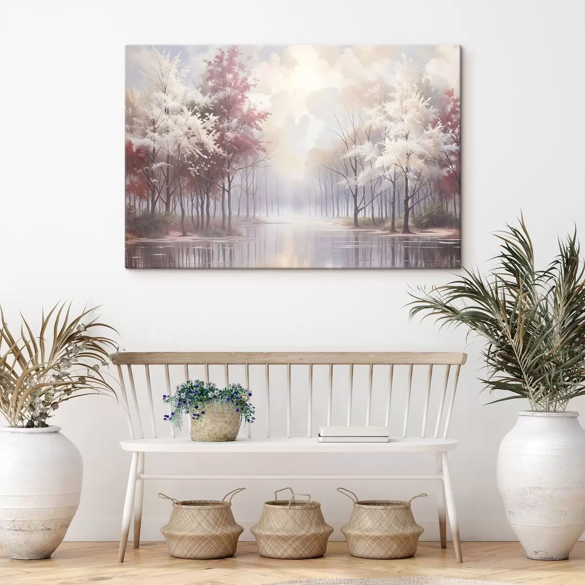 Tableau Un paysage serein avec une forêt brumeuse, des arbres dénudés et un lac calme reflétant les tons doux de rose et de blanc  s41720