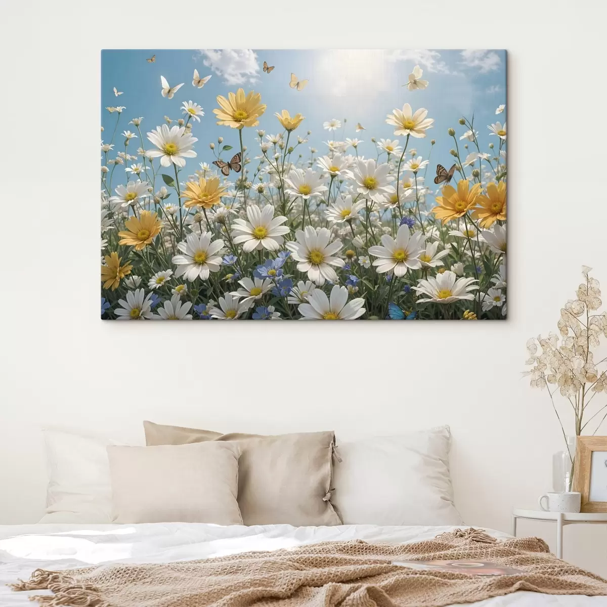 Tableau Un champ de marguerites blanches et jaunes sur fond de ciel bleu avec des nuages blancs cotonneux et des papillons volant au-dessus s41726