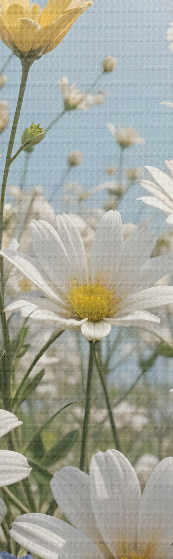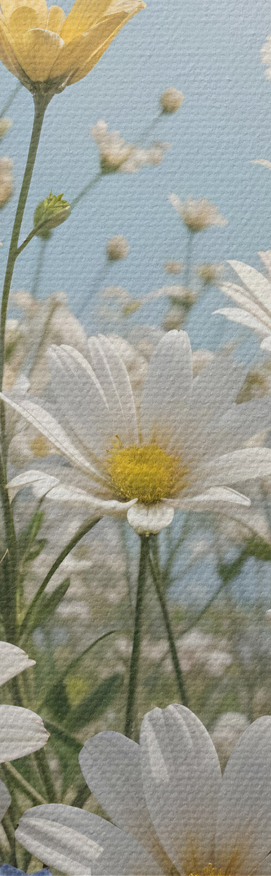 Tableau Un champ de marguerites blanches et jaunes sur fond de ciel bleu avec des nuages blancs cotonneux et des papillons volant au-dessus Nr s41726