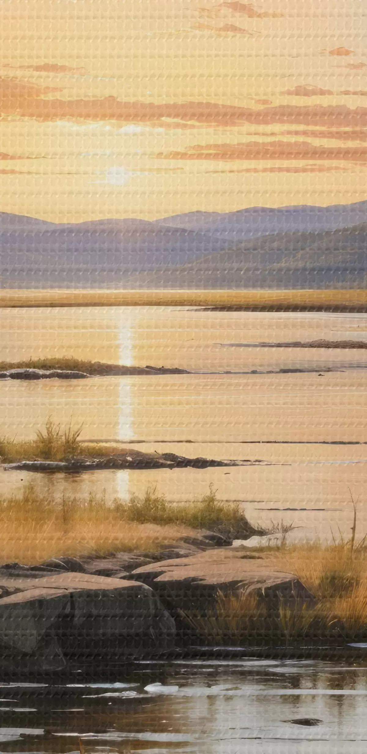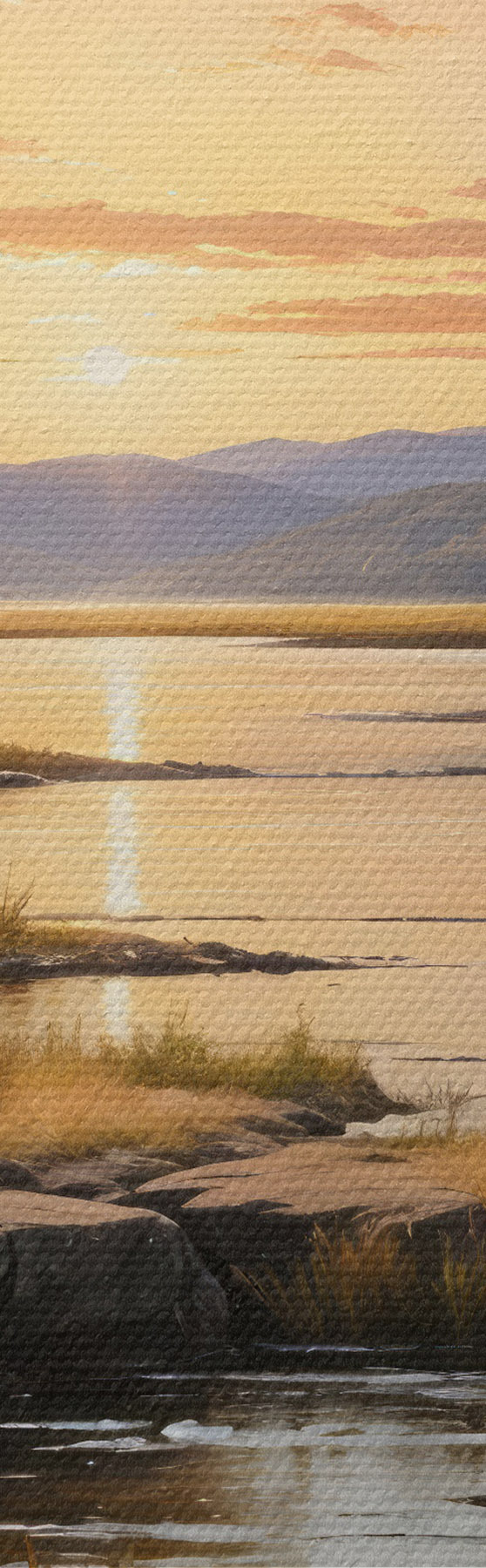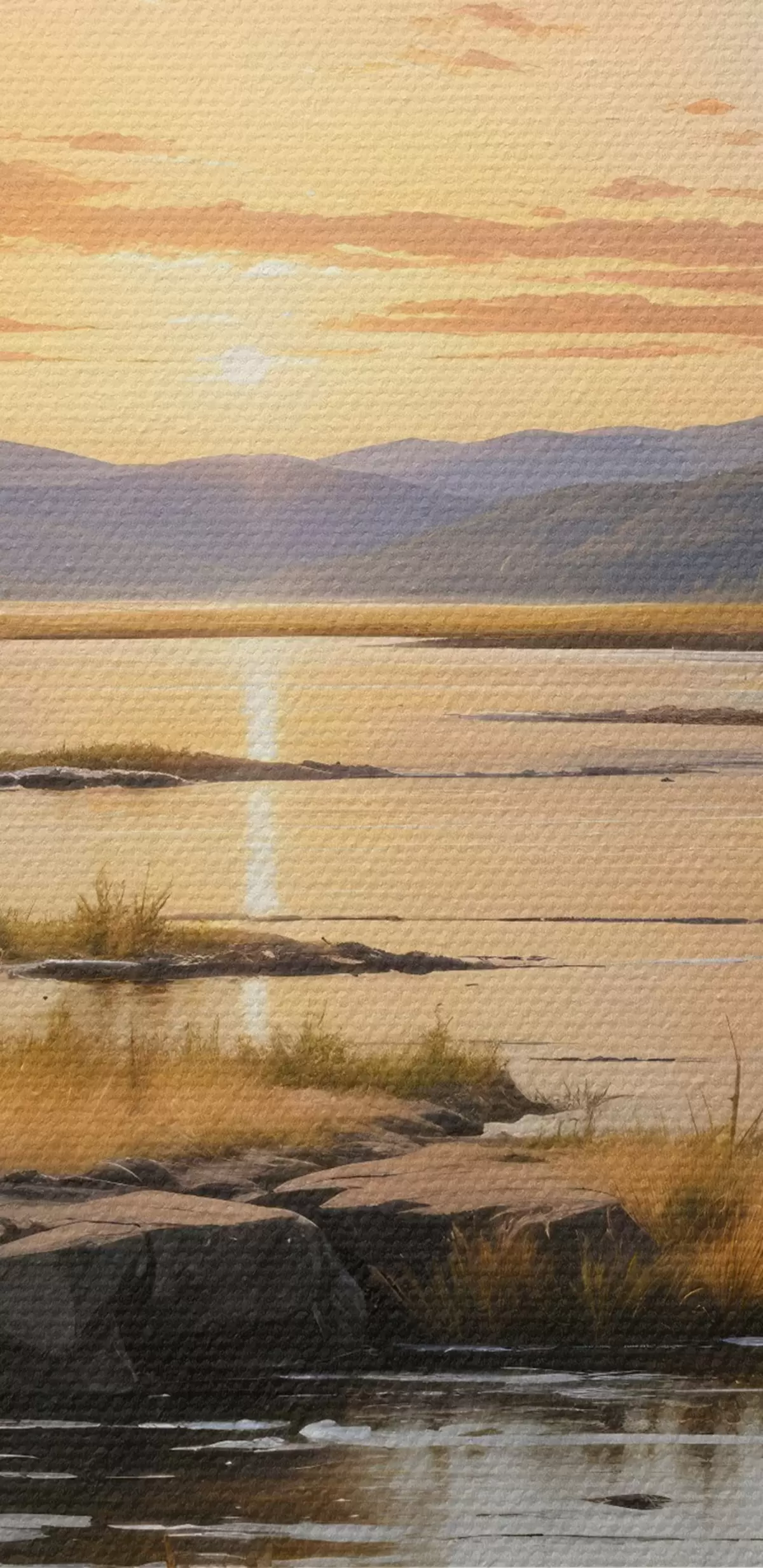 Tableau Un paysage serein avec un lac entouré de pins, reflétant les couleurs chaudes du ciel au coucher du soleil s41733