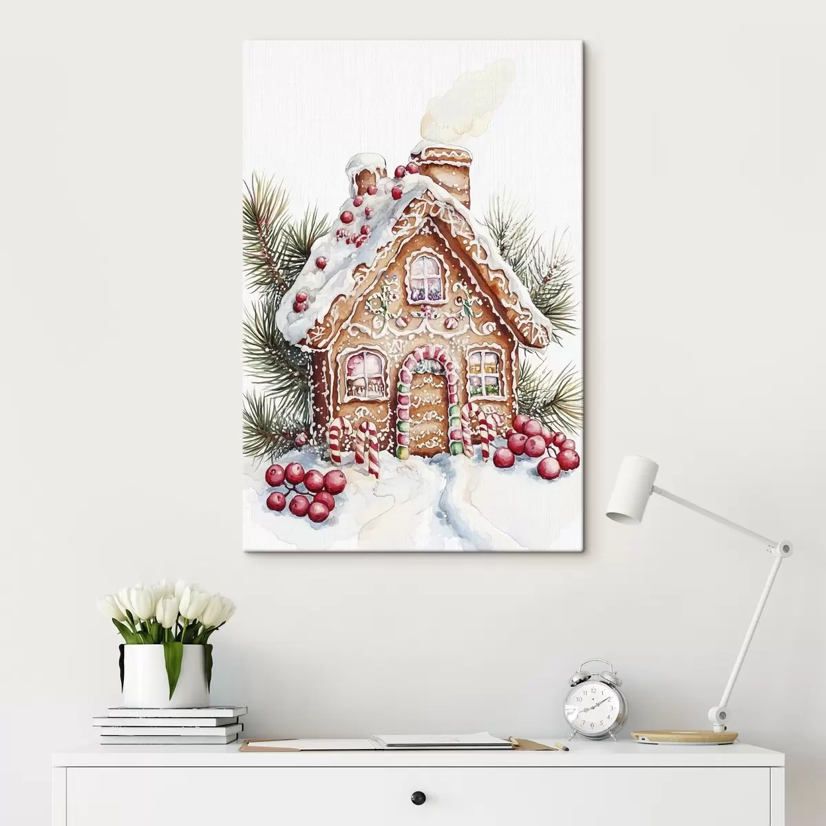 Tableau Maison en pain d'épices, branches de pin, baies rouges, Noël  s41946