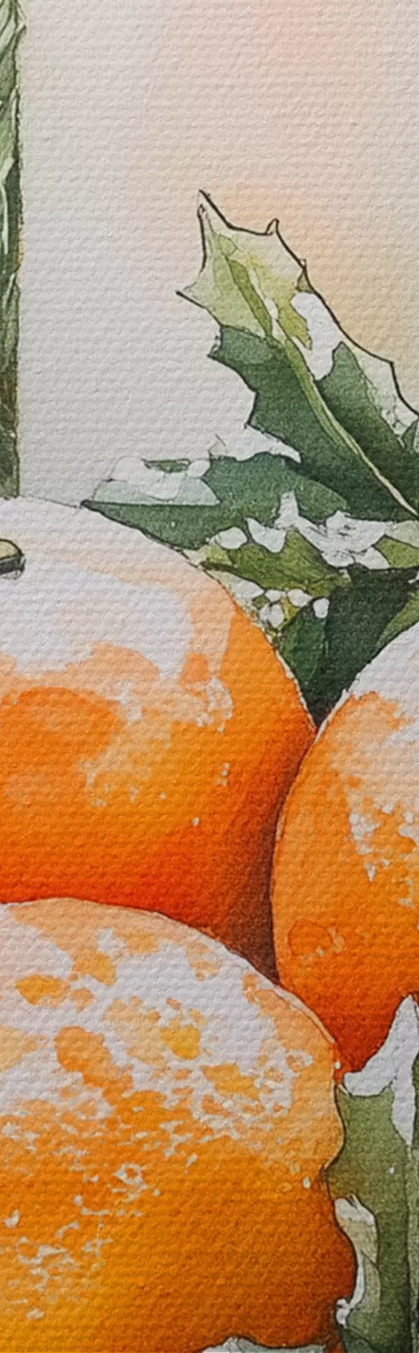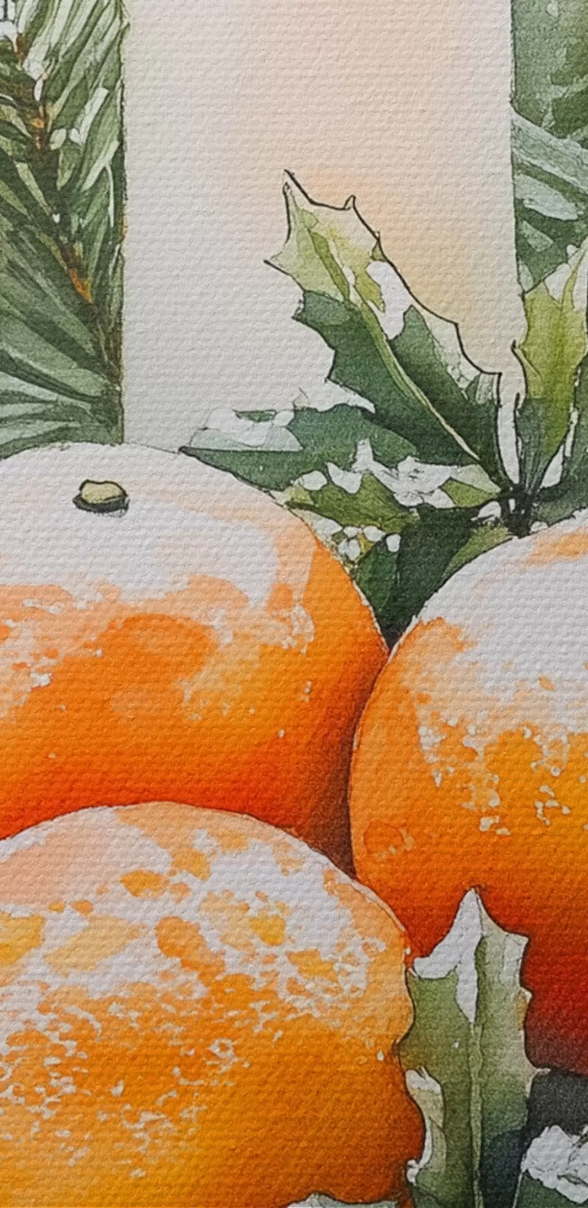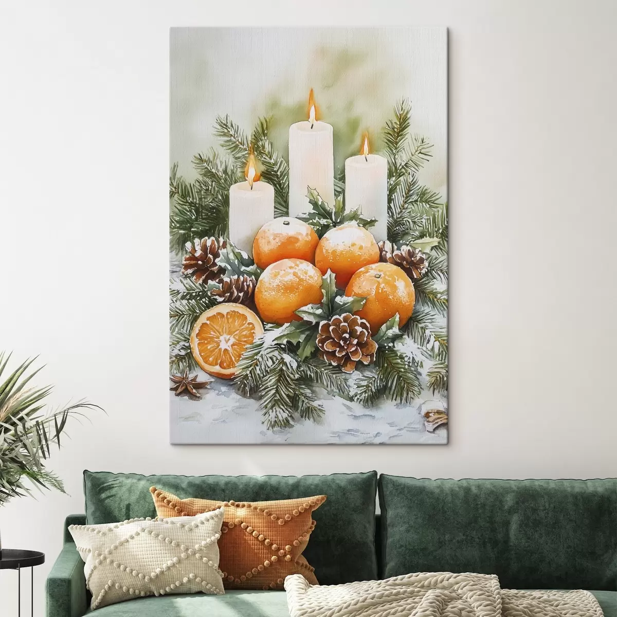 Tableau Décor de Noël avec bougies, sapin, cônes et oranges, style aquarelle Nr s41951