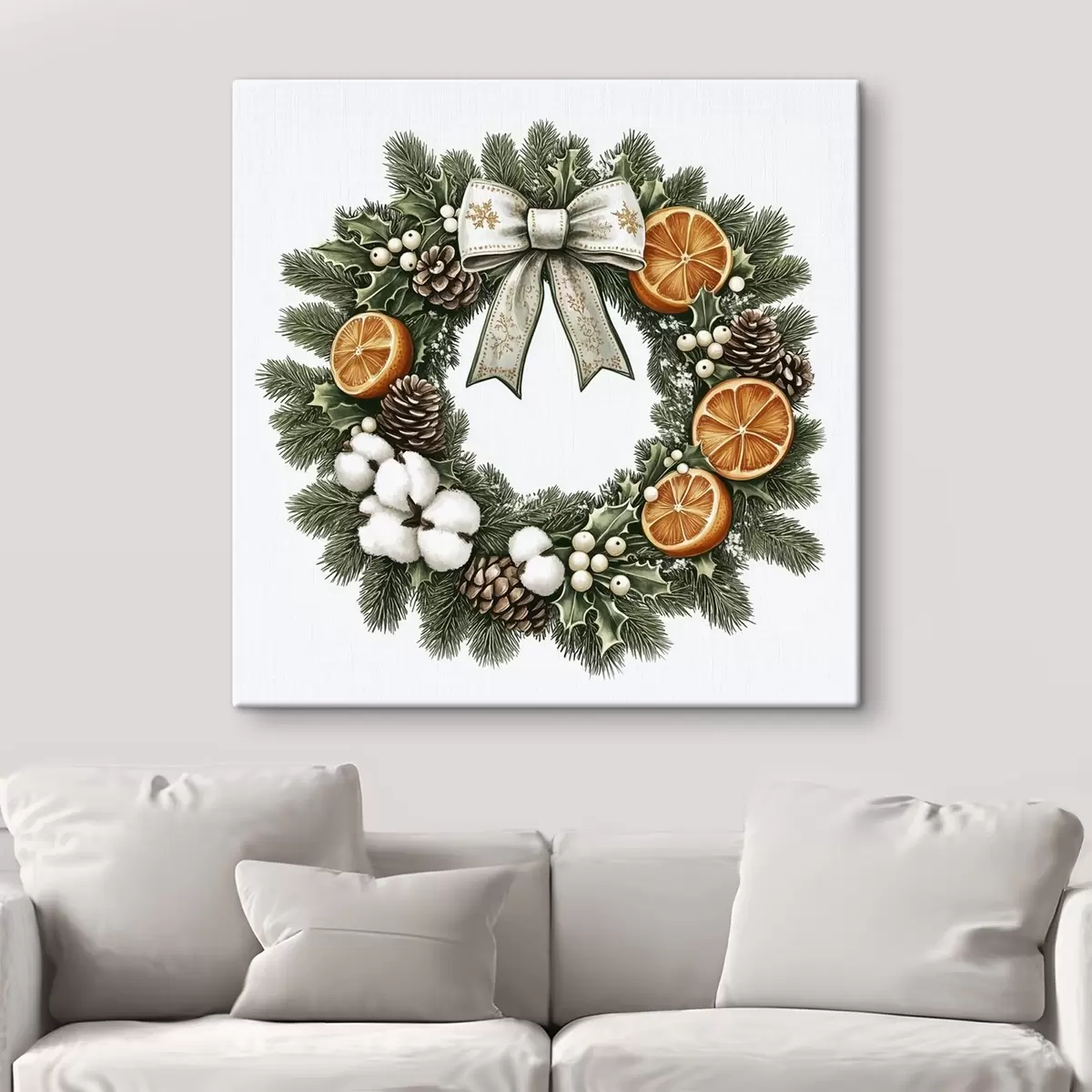 Tableau Couronne de Noël avec coton, oranges, baies sauvages et cônes, style aquarelle s41954