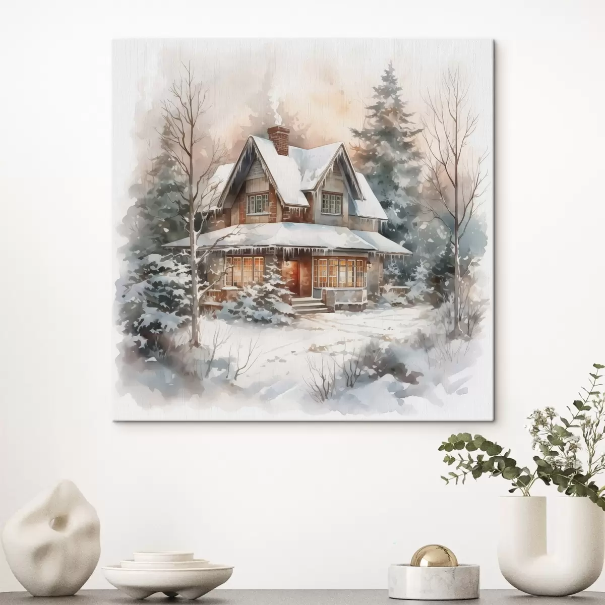 Tableau Maison dans une forêt enneigée imitation aquarelle s42137