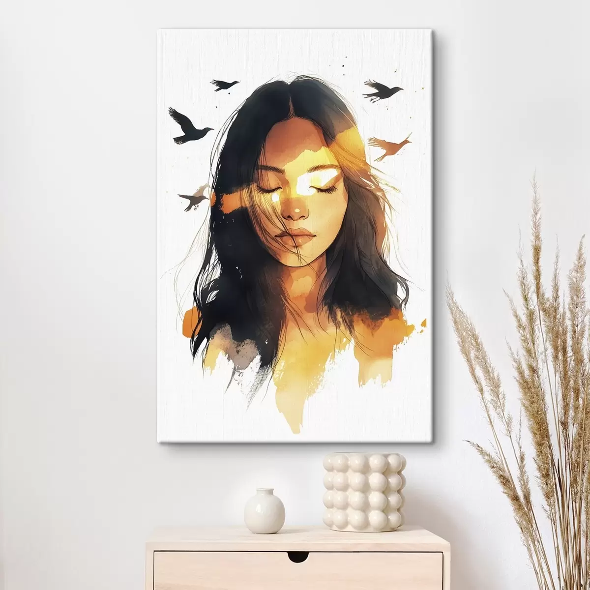 Tableau Portrait de style aquarelle, belle fille, lumière du soleil, oiseaux en vol Nr s42198