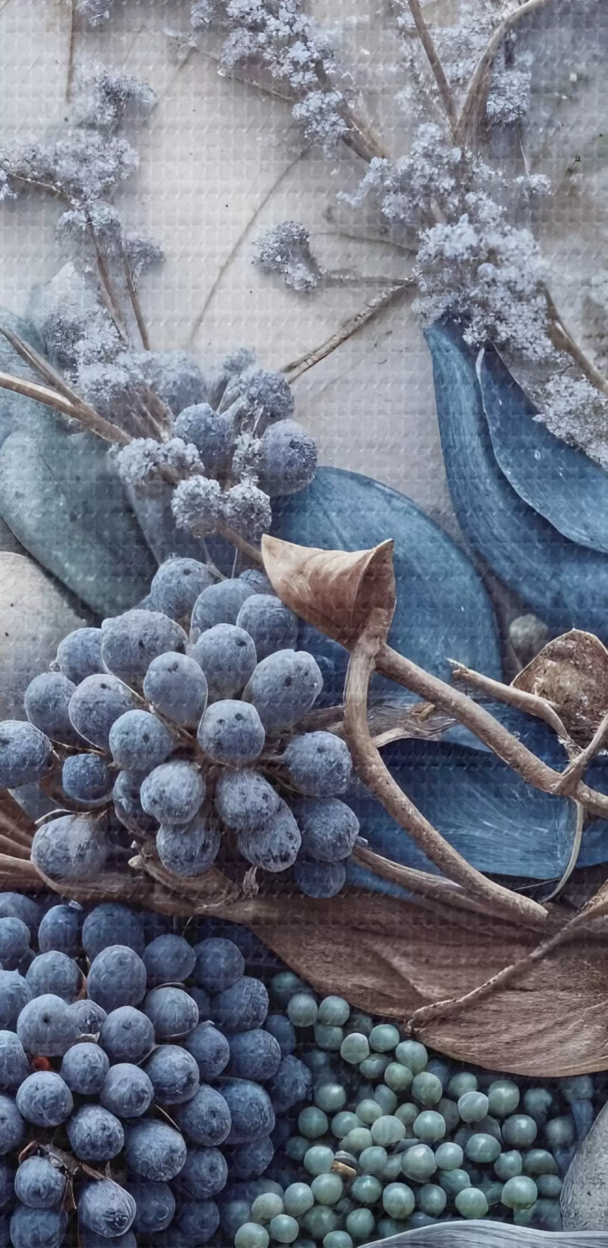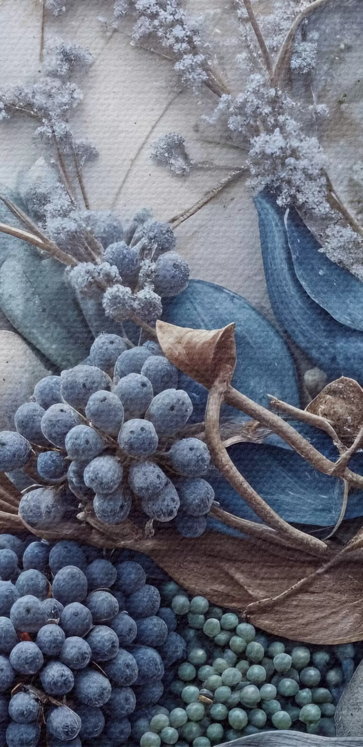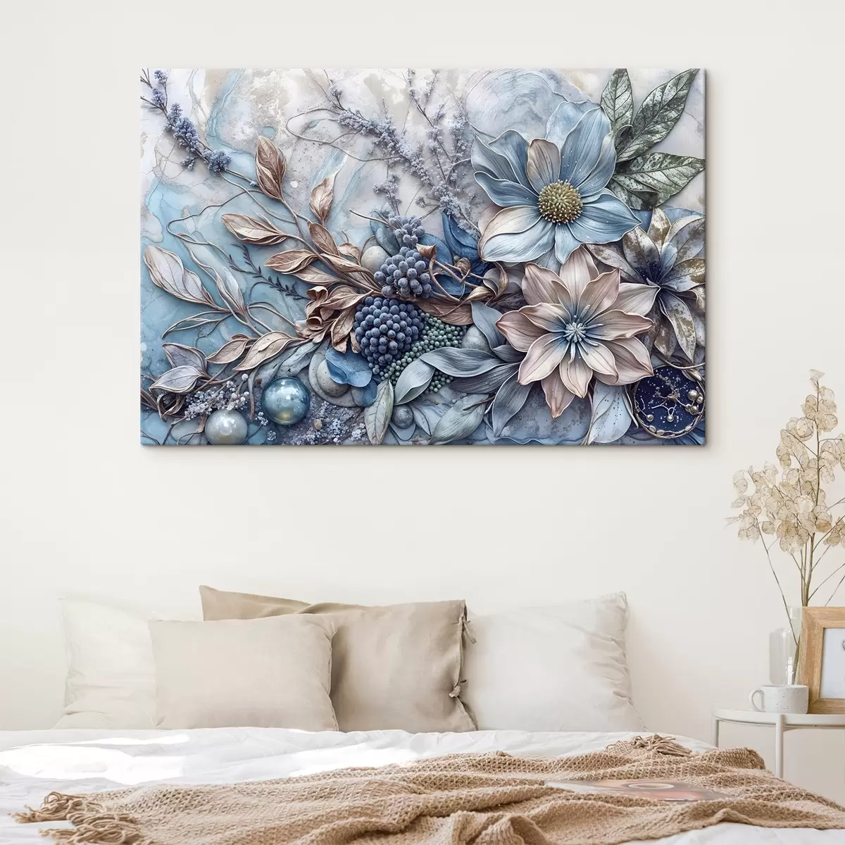 Tableau Une fleur luxuriante abstraite texturée et détaillée avec de grandes fleurs bleues et roses vibrantes, des baies et d'autres éléments botaniques Nr s42210