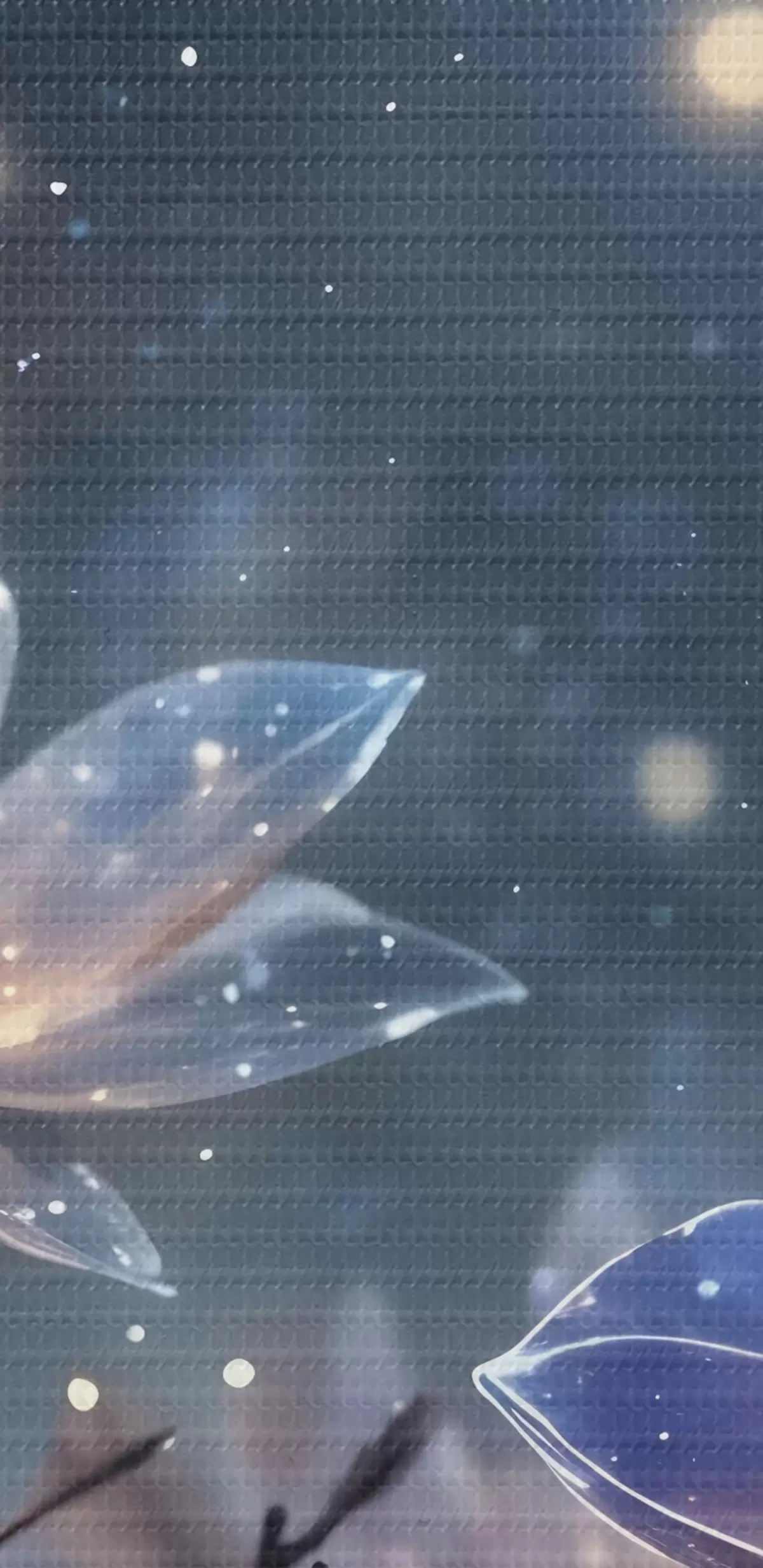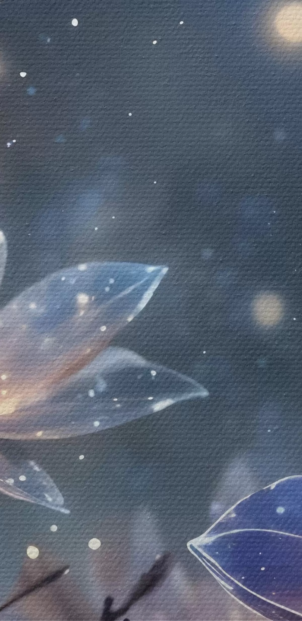 Tableau Fleurs fantaisistes abstraites sur des branches avec des pétales texturés, des étoiles et une lune dans un ciel nocturne s42211