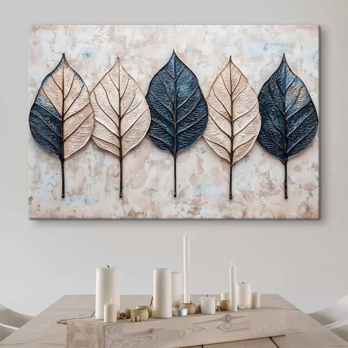 Tableau Feuilles d'automne abstraites assorties dans différentes nuances de brun, de beige et de bleu, disposées en rang sur un fond clair s42217