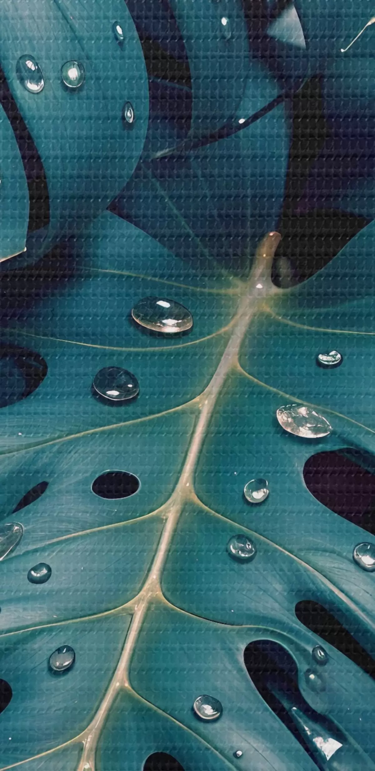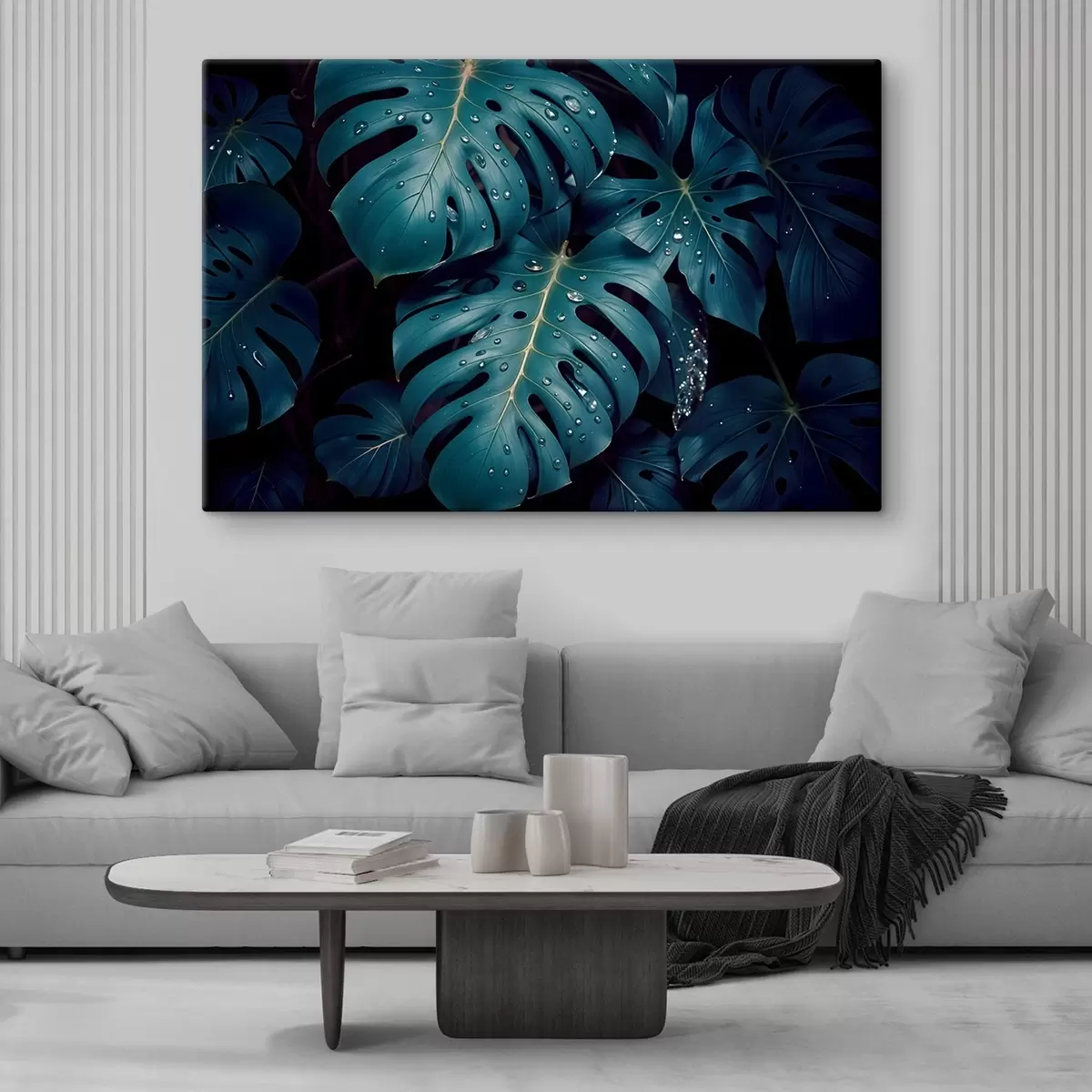 Tableau Feuilles de monstera tropicales luxuriantes avec des gouttelettes d'eau sur un fond sombre, créant une impression lunatique et atmosphérique s42233