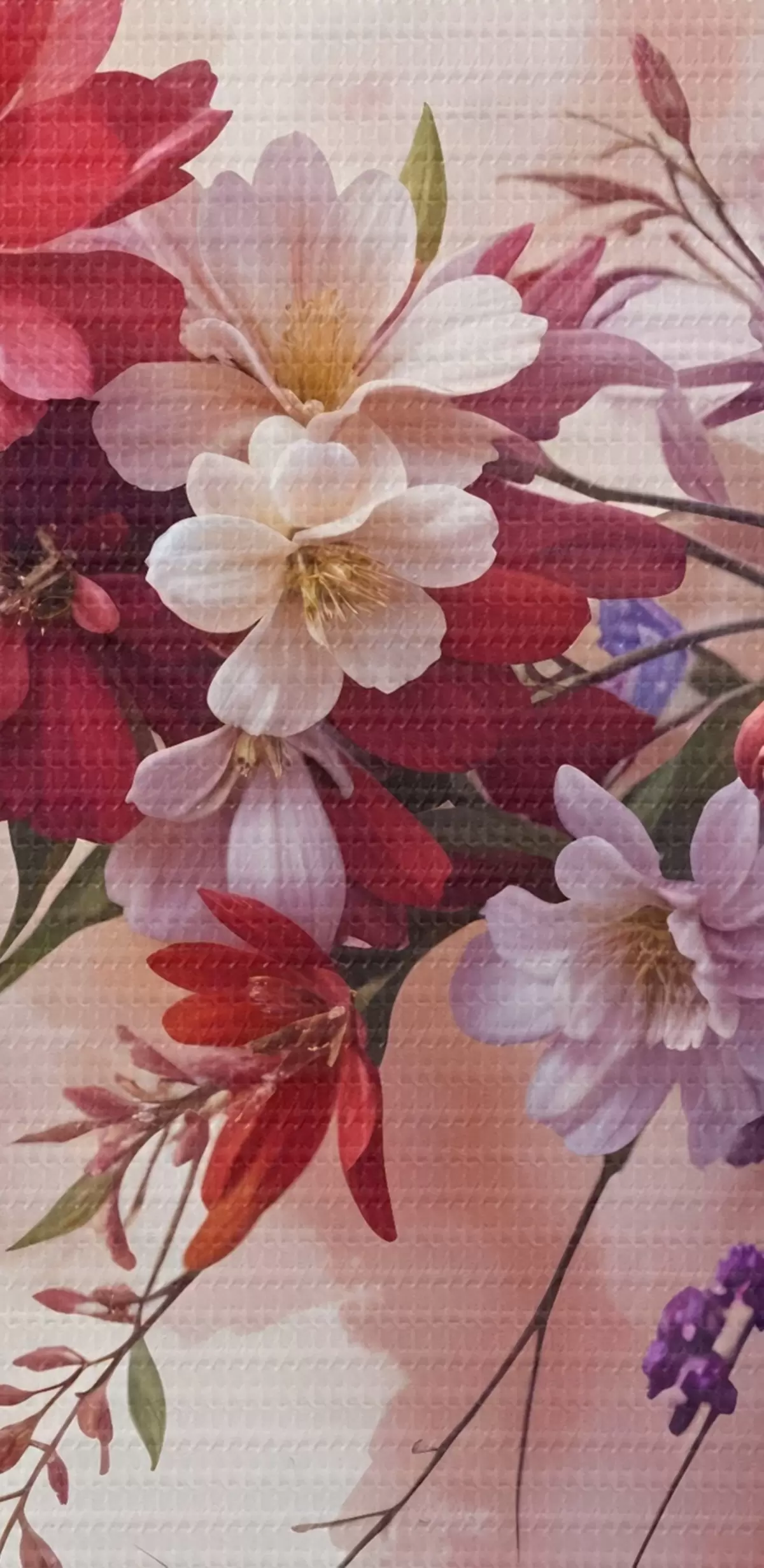 Tableau Fleurs colorées comprenant des dahlias rouges, roses et violets, des marguerites et d'autres fleurs sur un fond doux et flou  s42234
