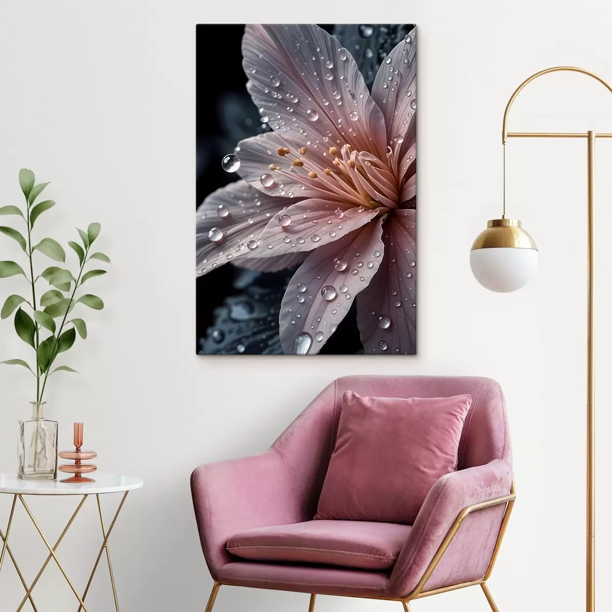 Tableau Gros plan d'une fleur rose aux pétales délicats couverts de gouttelettes d'eau, sur un fond sombre  s42237