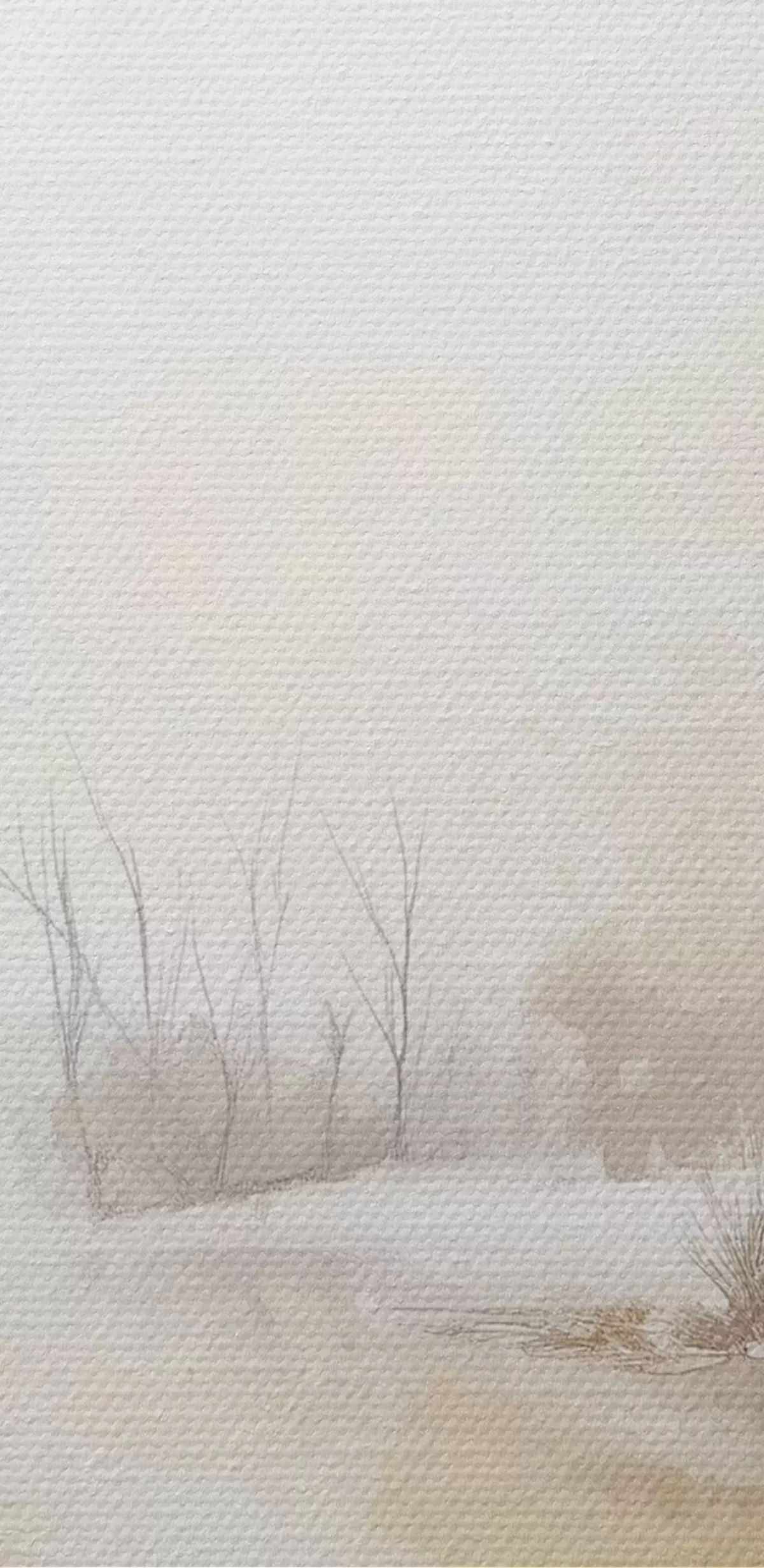 Tableau Paysage d'hiver, rivière et arbres, style aquarelle, couleurs beiges s42376