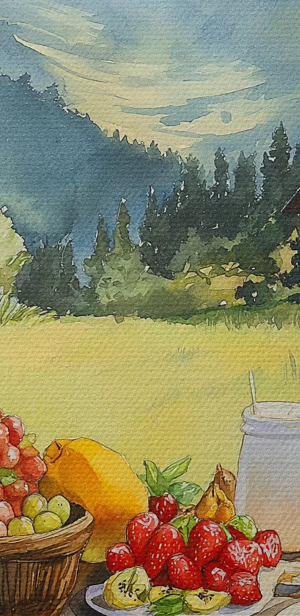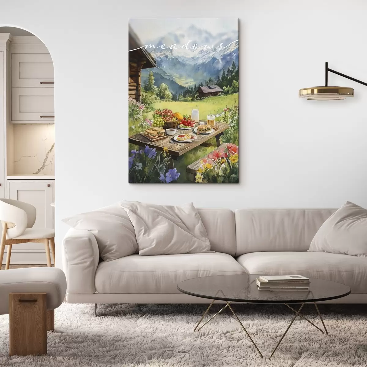 Tableau Paysages de montagne, prairie d'été, maisons en bois, petit déjeuner Nr s42425
