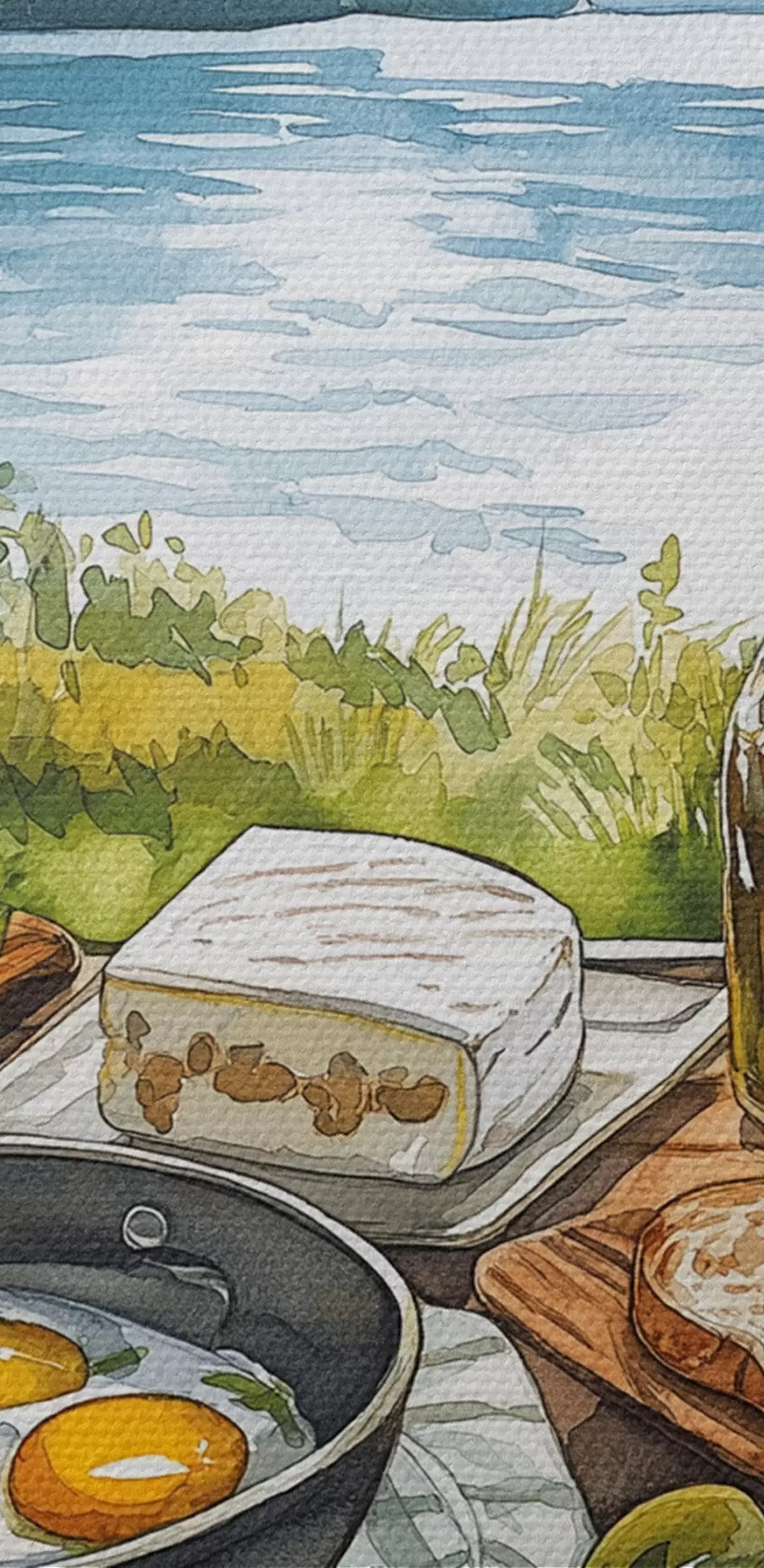Tableau Camping esthétique, style aquarelle, lac d'été, nature, nourriture s42428
