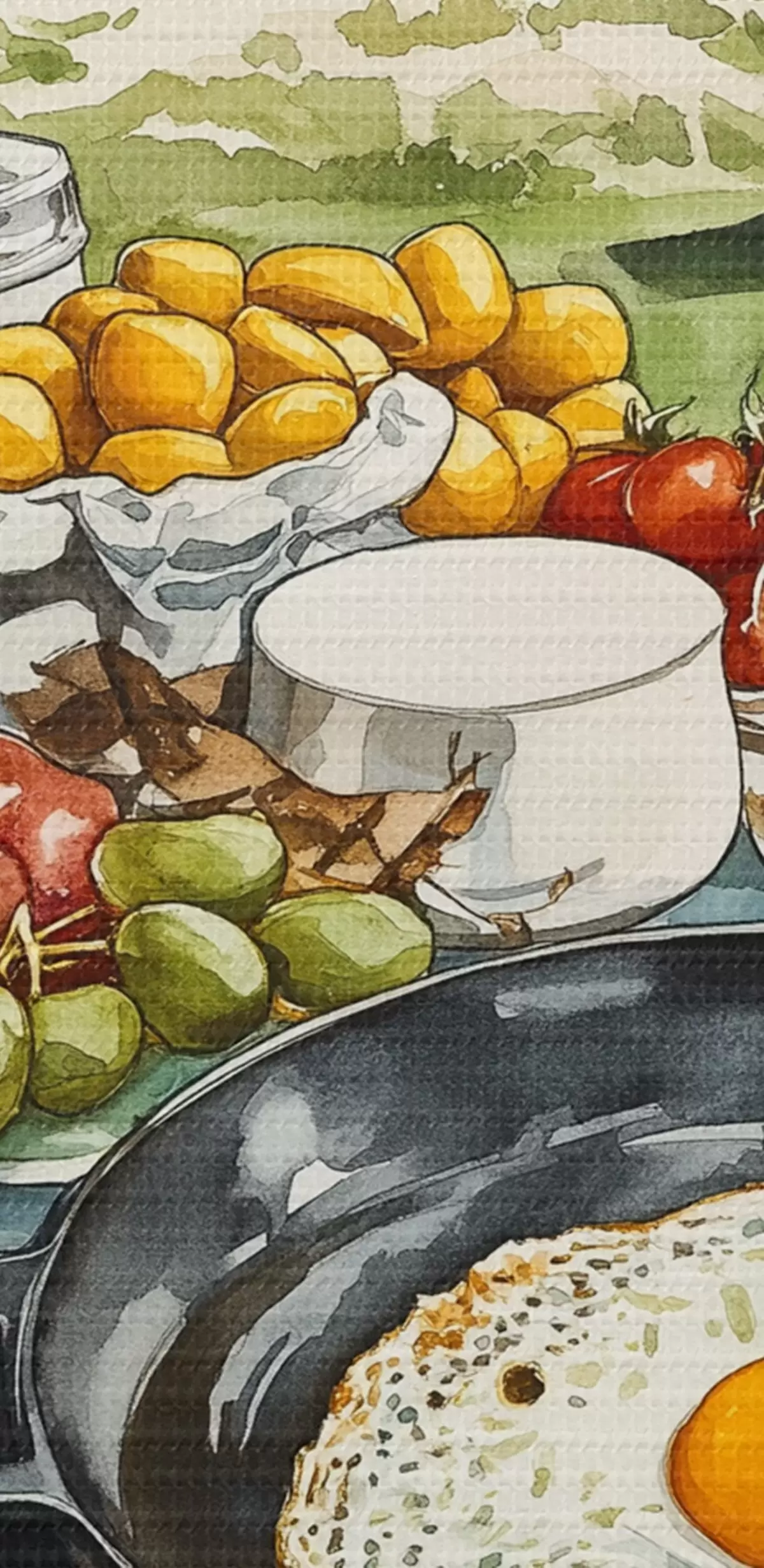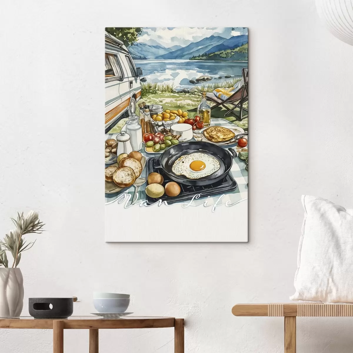 Tableau Magnifique petit déjeuner de style aquarelle, vie en camionnette, camping, montagnes Nr s42429