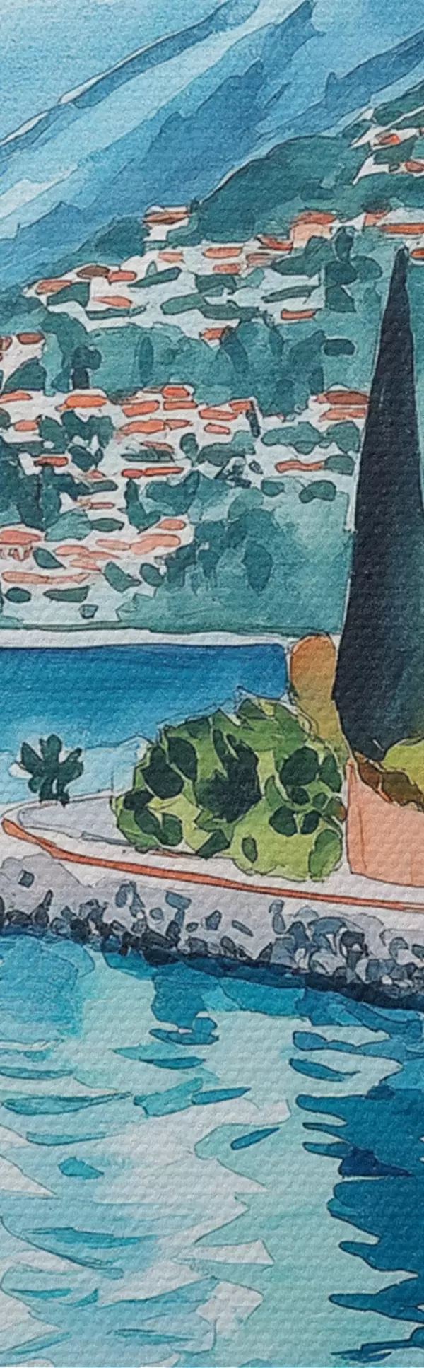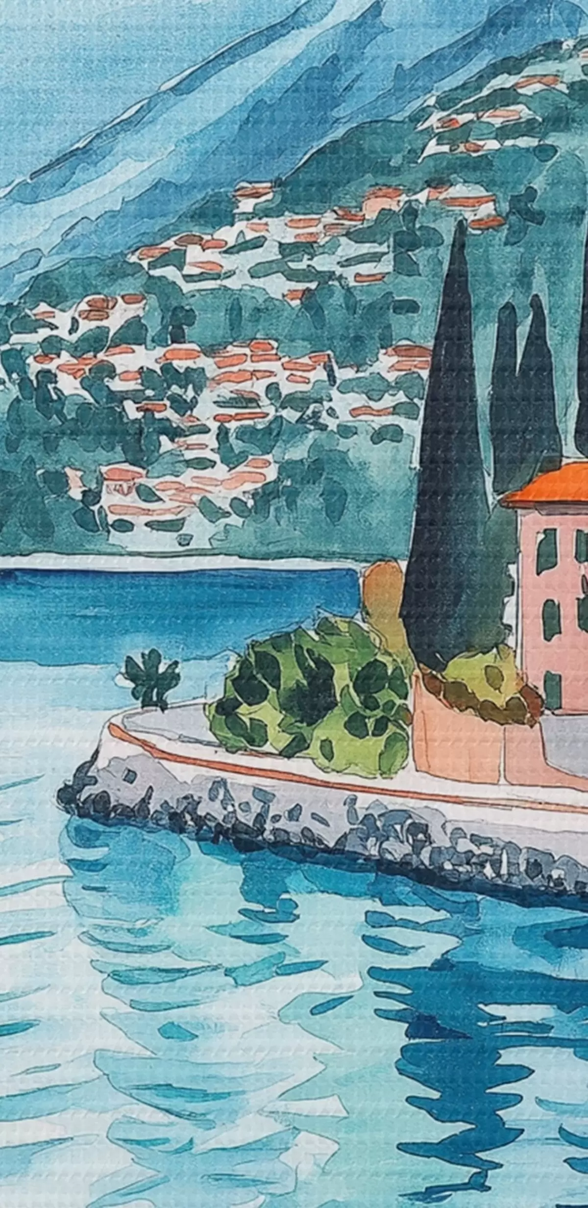 Tableau Lac de Côme, Italie, style aquarelle, pizza, cocktails, vieille ville, montagnes  s42437