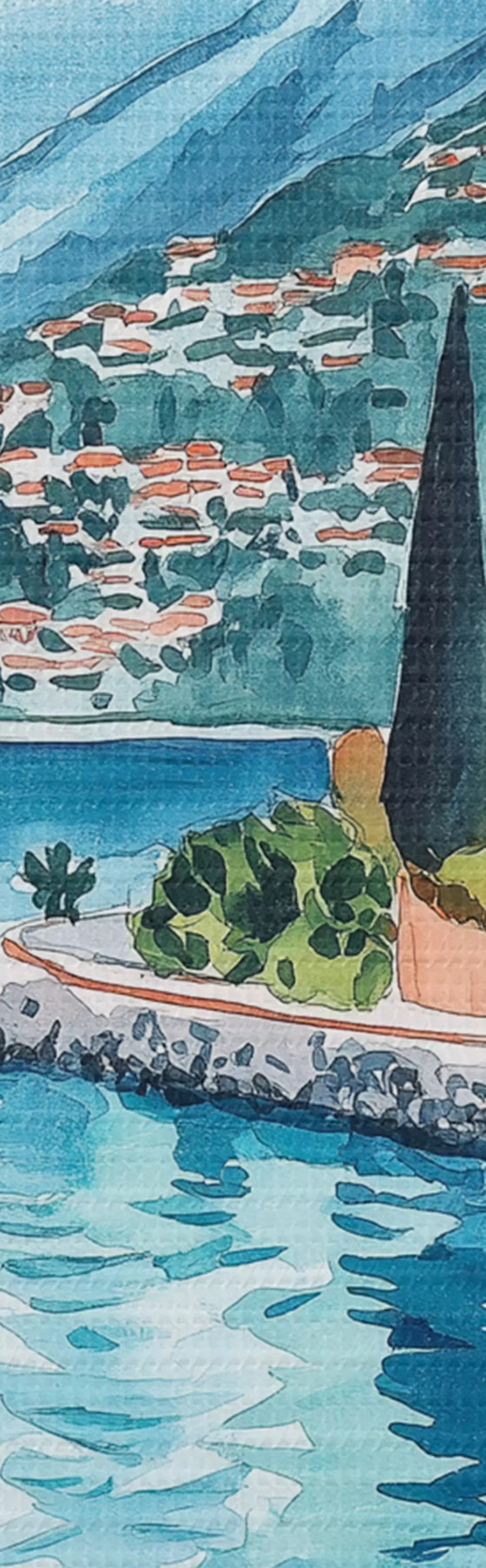 Tableau Lac de Côme, Italie, style aquarelle, pizza, cocktails, vieille ville, montagnes Nr s42437